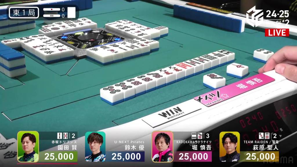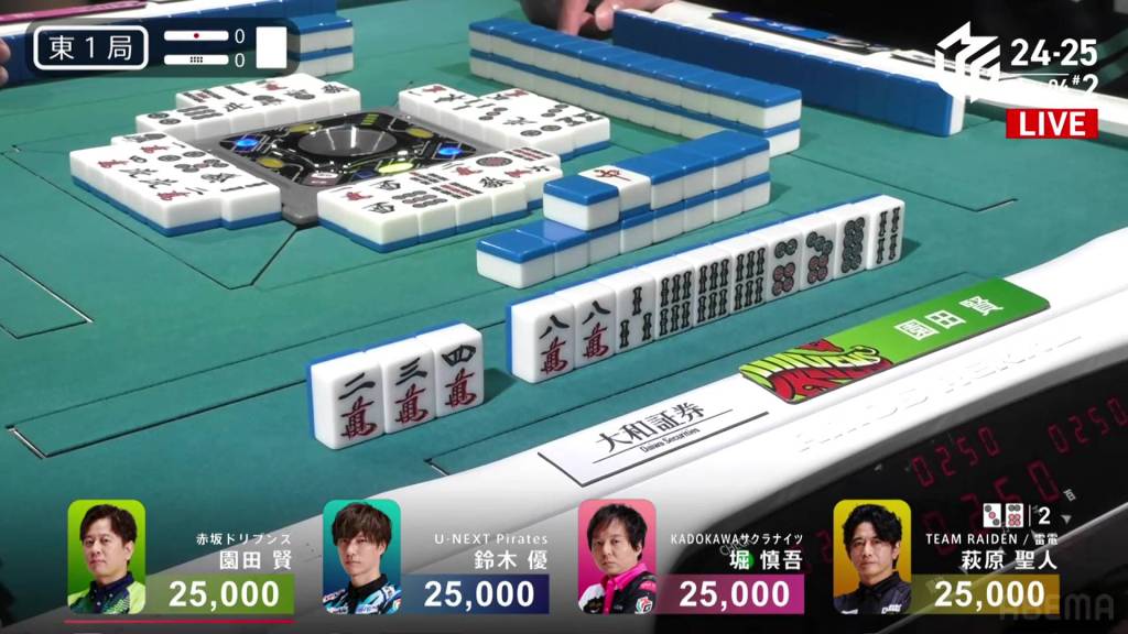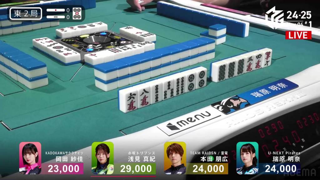 In E2-0, Asami is the dealer in 1st place, looking to extend her 5,000 lead.