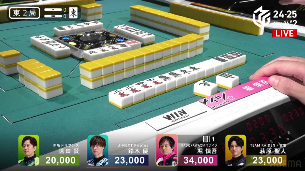 After avoiding the ippatsu round, Hagiwara gets to tenpai and calls riichi on a 25p ryanmen. On Hagiwara’s ippatsu round, Hori draws and discards the 2p and deals into Hagiwara. Hagiwara wins the hand with Riichi/Ippatsu/Pinfu/Tanyao for 8,000 plus Hori’s riichi stick, moving into 2nd place.