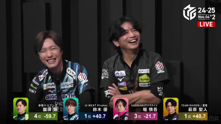 With that, Yu and Hagiwara tie for 1st place, the first 1st place tie since May 3, 2023 when Date and Okada tied for 1st. The lights in the back ground start out blue, then change to yellow. In the post-game interview, both players get their time in the spotlight (along with 4th place Sonoda).