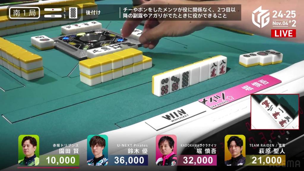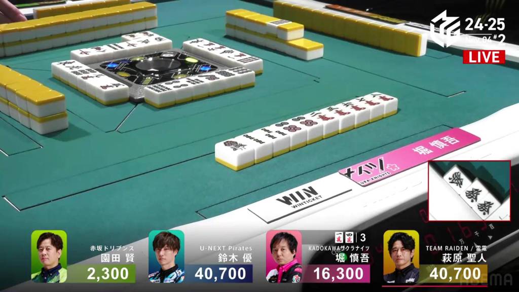 In the second row, it is Hagiwara’s turn to make progress. With a pon on the red dragon and making a triplet of easts, Hagiwara is the first to tenpai and waits on a 36p ryanmen.
