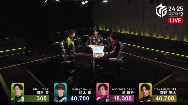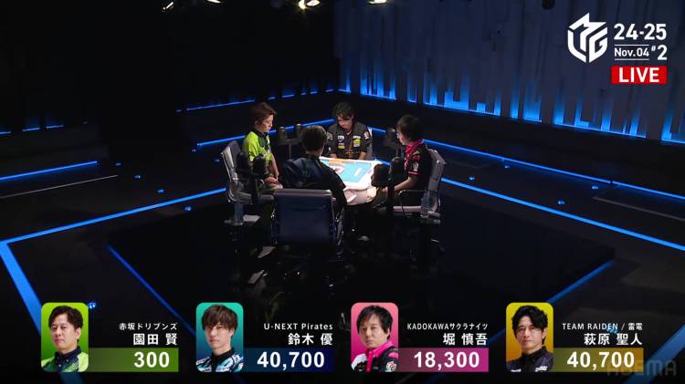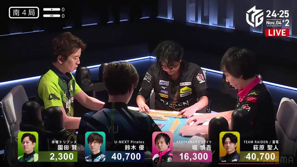 In S4-0, both Yu and dealer Hagiwara have a score of 40,700, meaning that they are tied for 1st place. If Sonoda hits Hori with a ron, or vice versa, the game will finish with the two of them tied. If Sonoda or Hori win by tsumo, Hagiwara will be hit with the dealer penalty and fall below Yu.