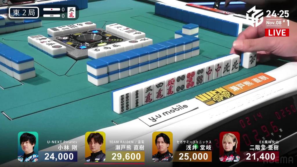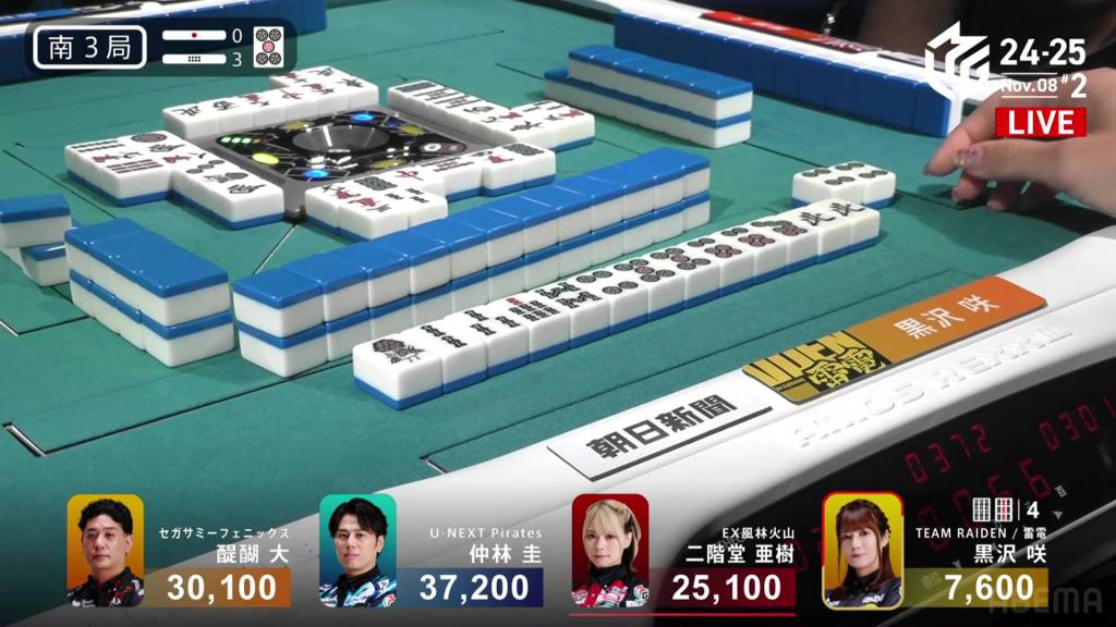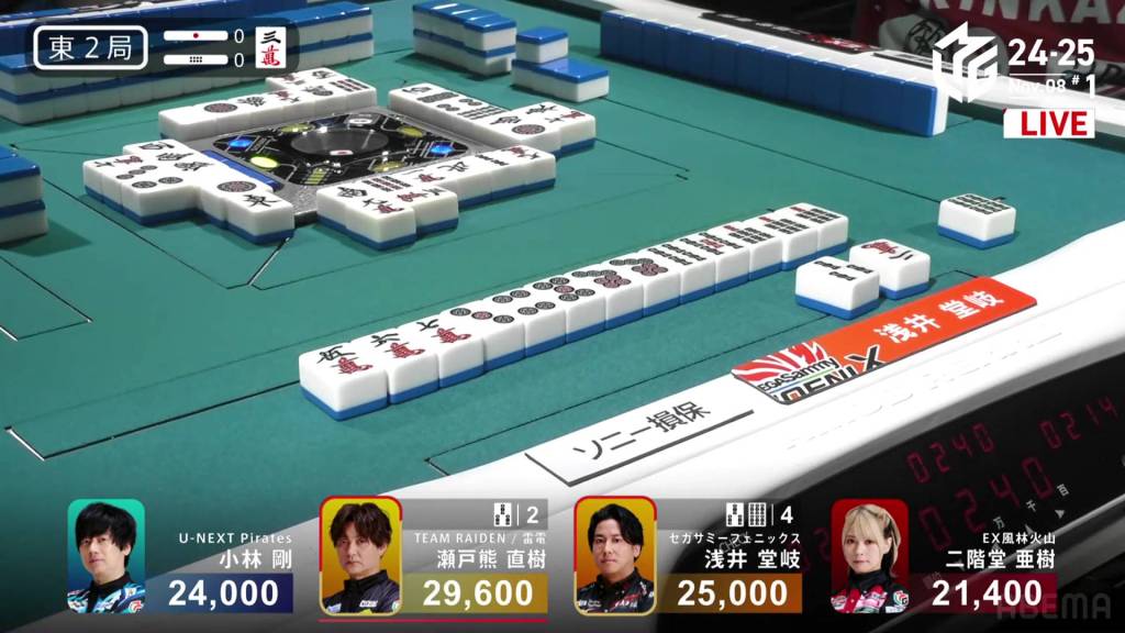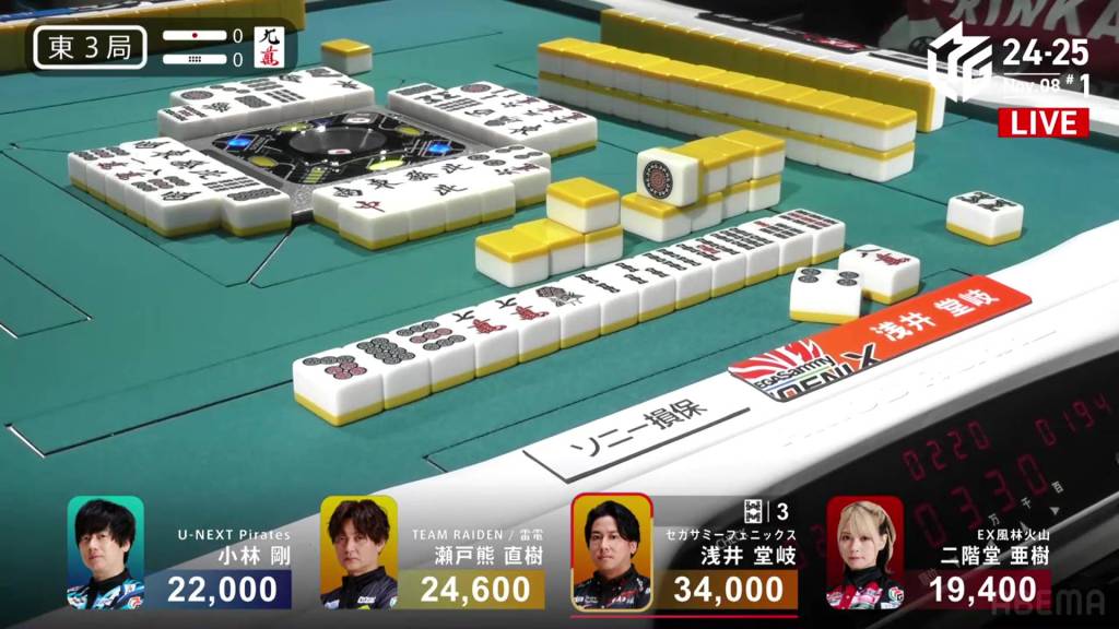 In E3-0, Takaki is now the dealer with a 9,400 lead over 2nd place Setokuma.