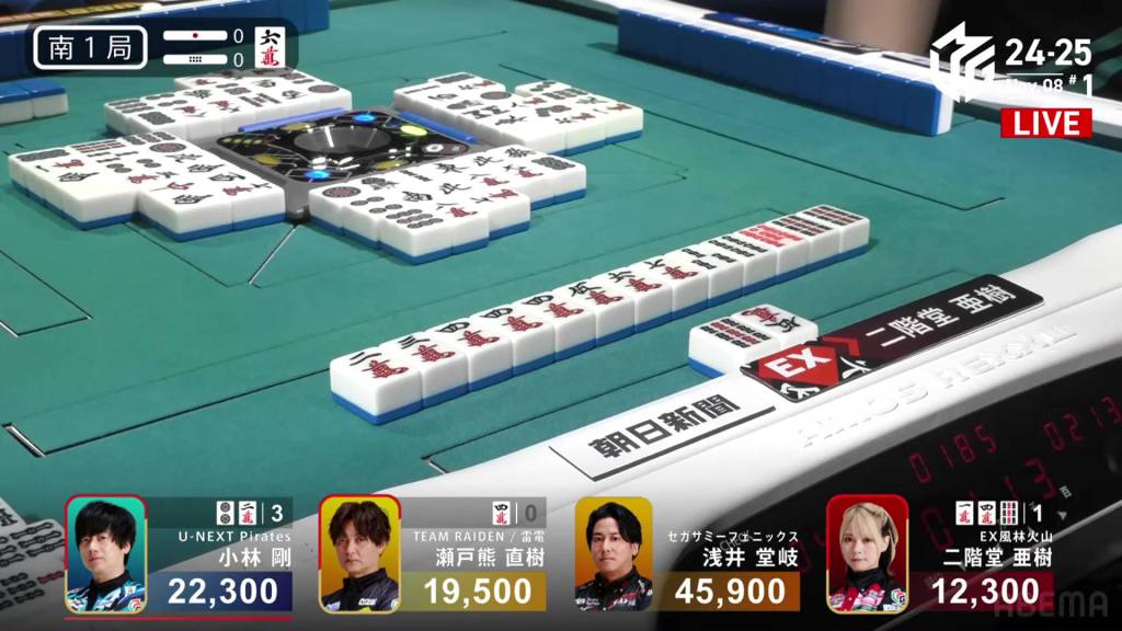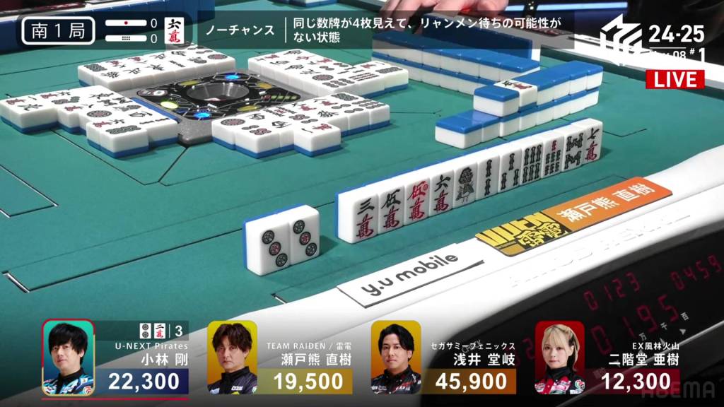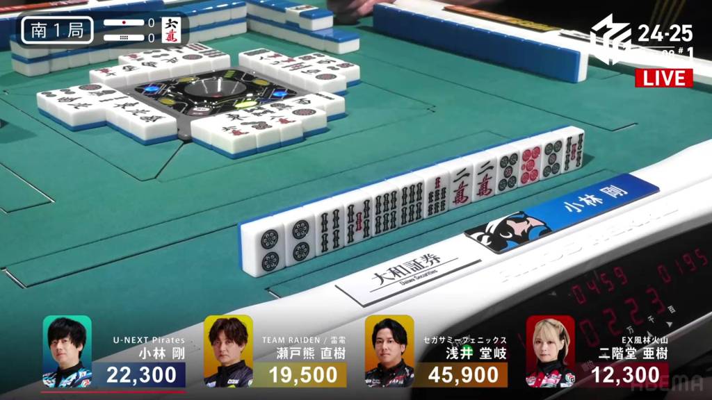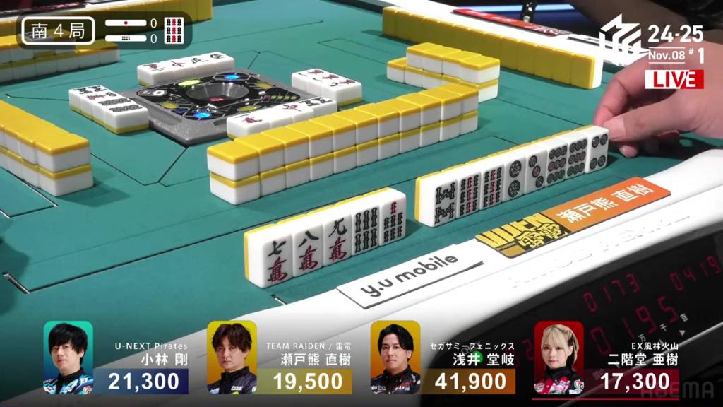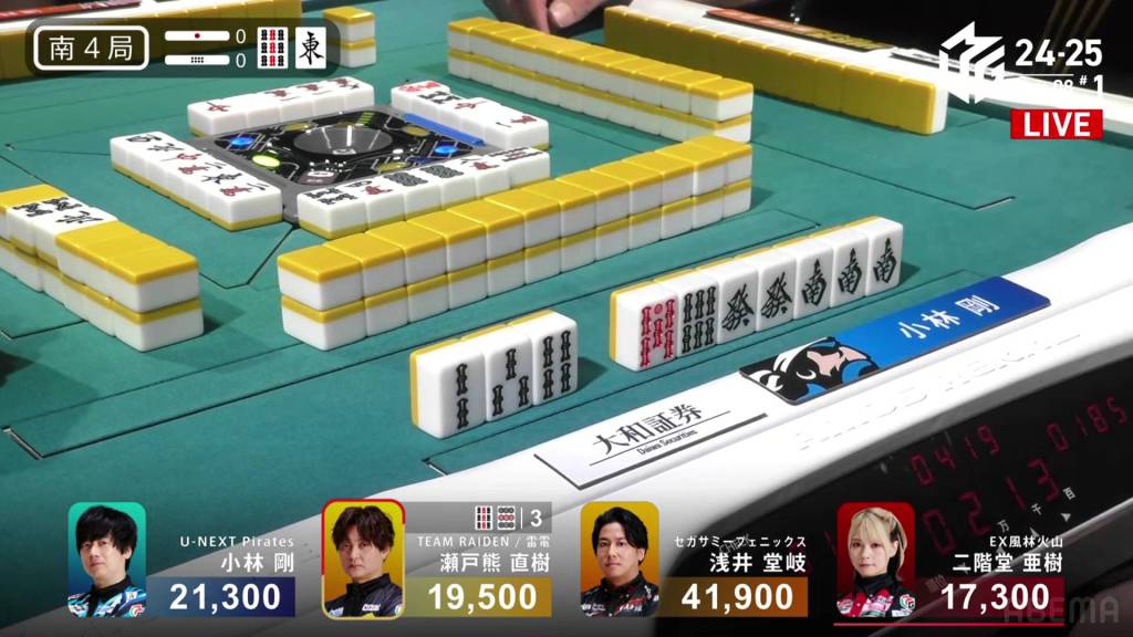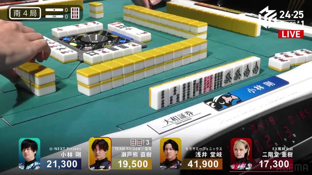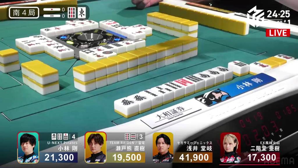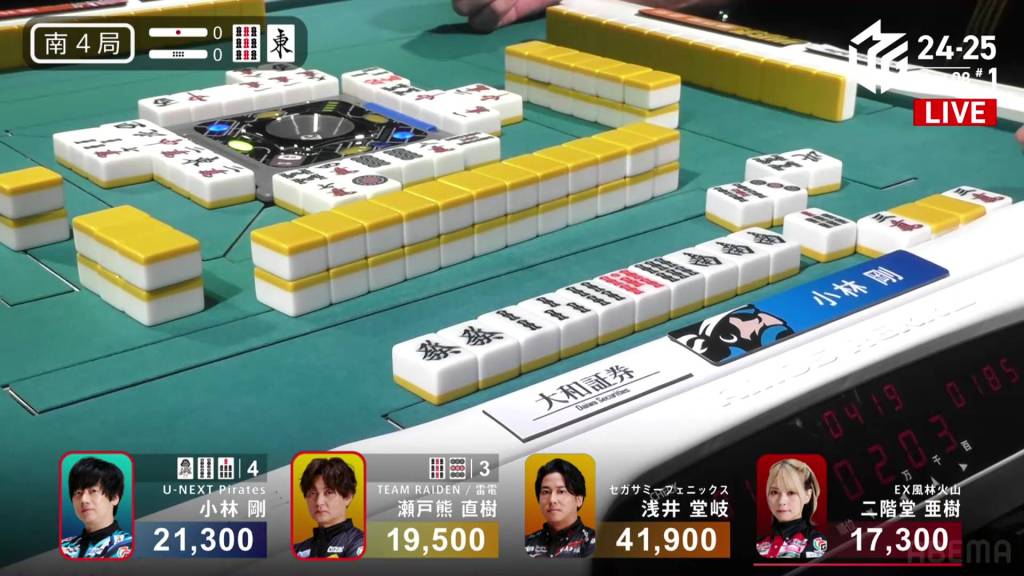 In S4-0, Kobayashi is in 2nd place, holding a 1,800 lead over 3rd place Setokuma and 20,600 behind 1st place Takaki. Any win will get keep him positive, but he needs at least a haneman direct hit or a sanbaiman to get to 1st.