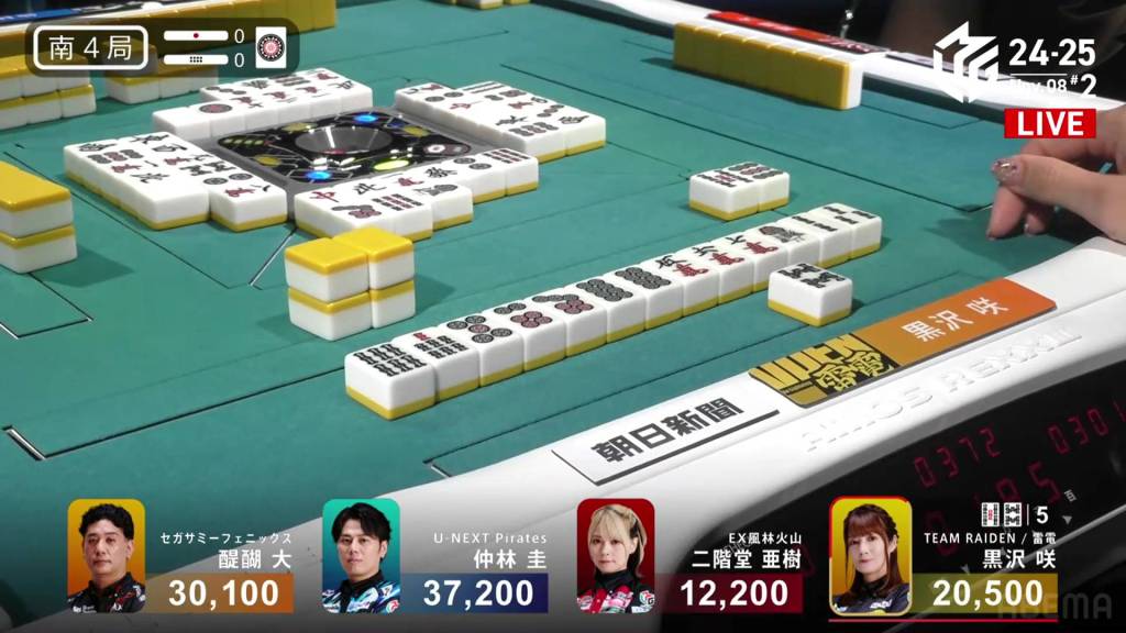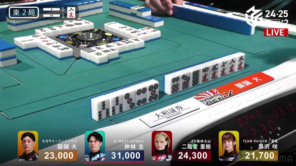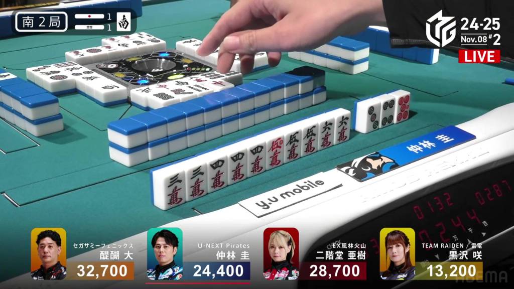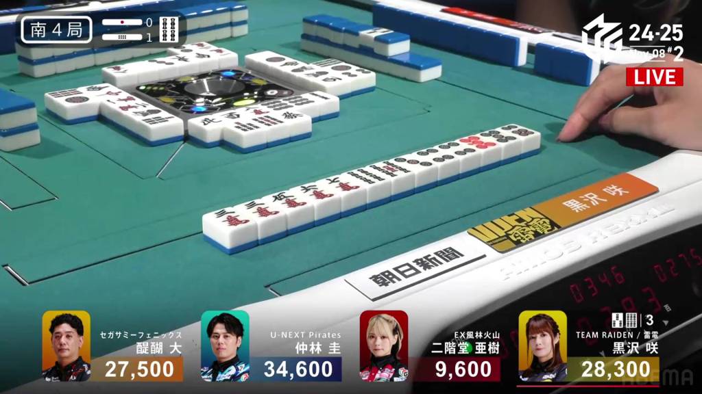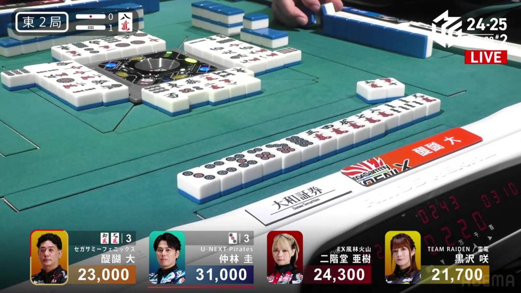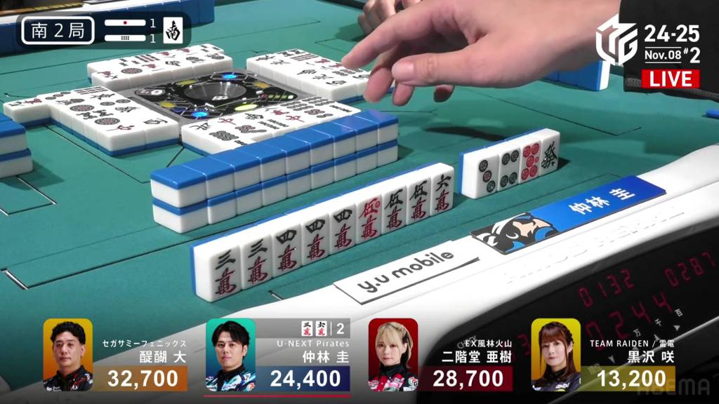 In S2-1, Nakabayashi is the dealer in 3rd place, 4,300 behind 2nd place Aki and 8,300 behind 1st place Daigo. 1,300 is up for grabs for the next winner.