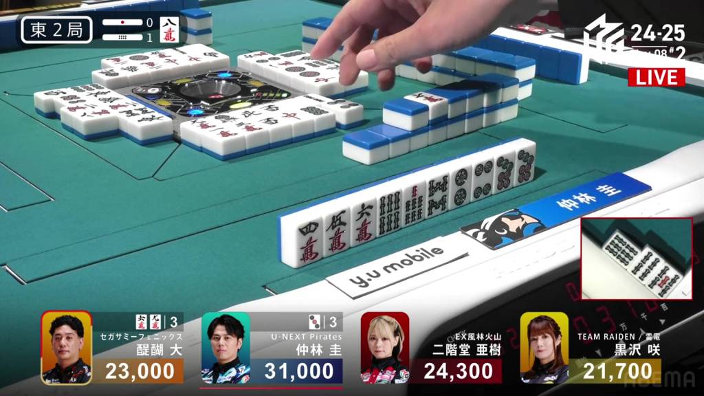 On Kurosawa’s turn, she fills in the 6p kanchan and calls riichi on a 58s ryanmen. If she wins on the 5s, she will have mangan.