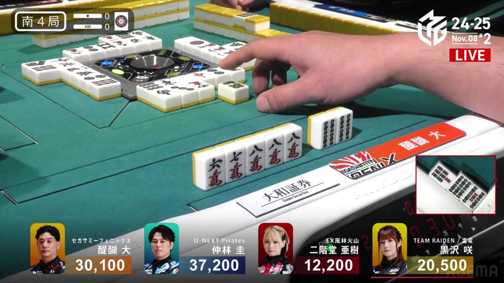 Daigo is sitting in 3rd place, 1,300 behind 2nd place Aki and 8,000 behind 1st place Nakabayashi.