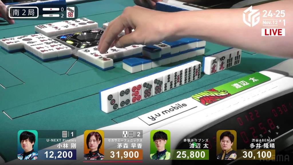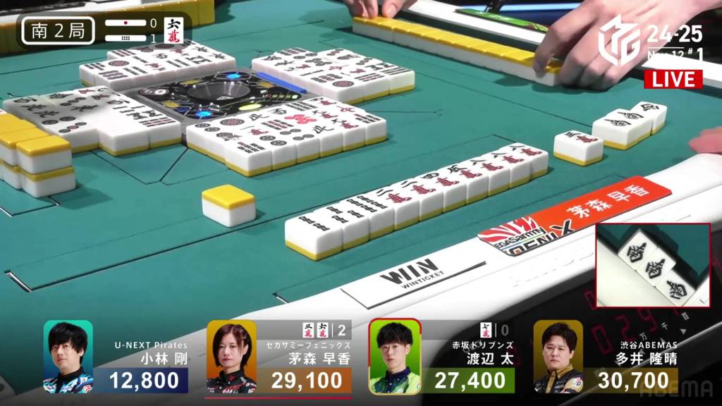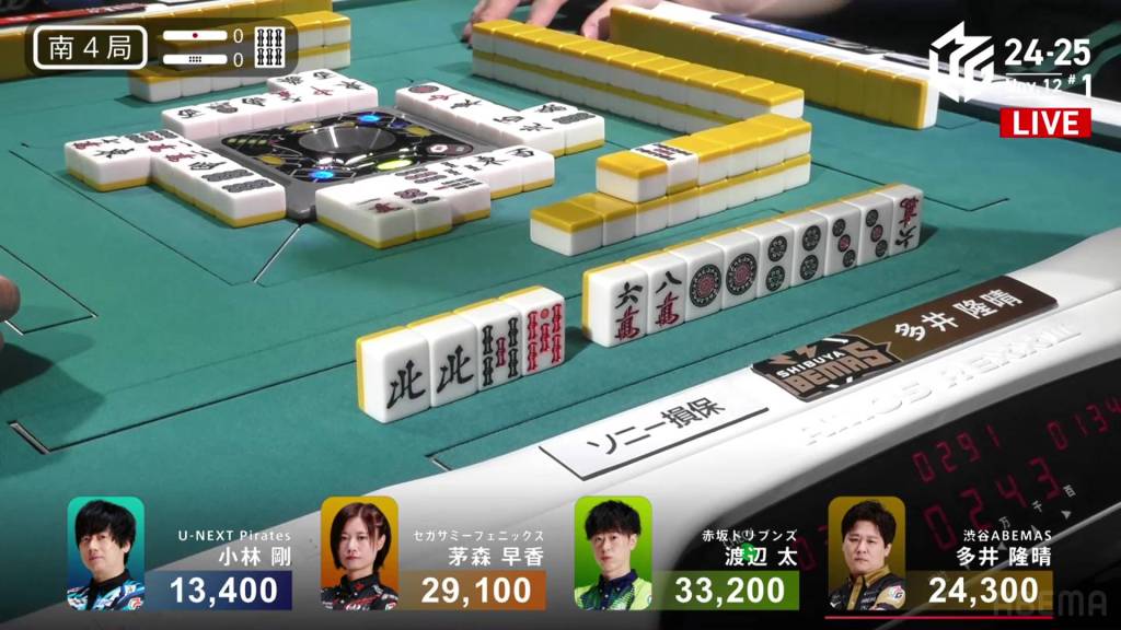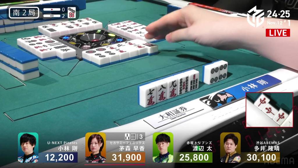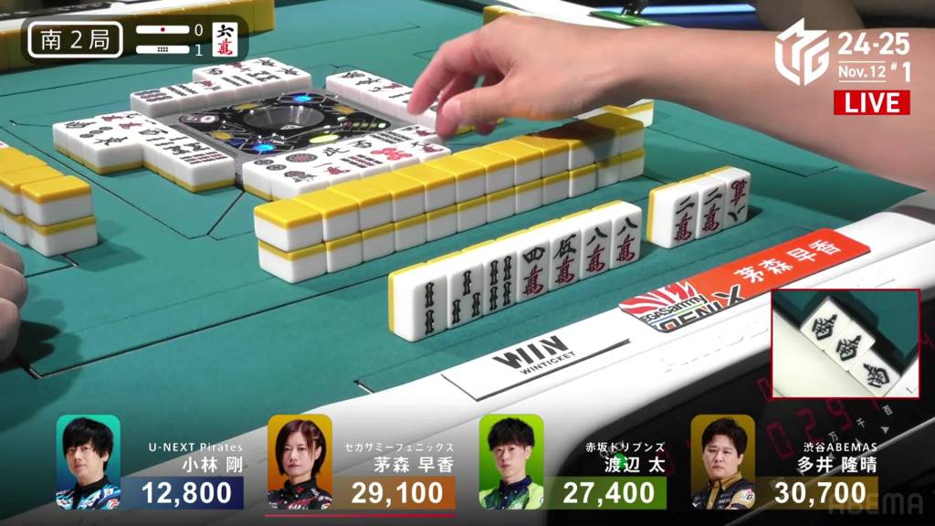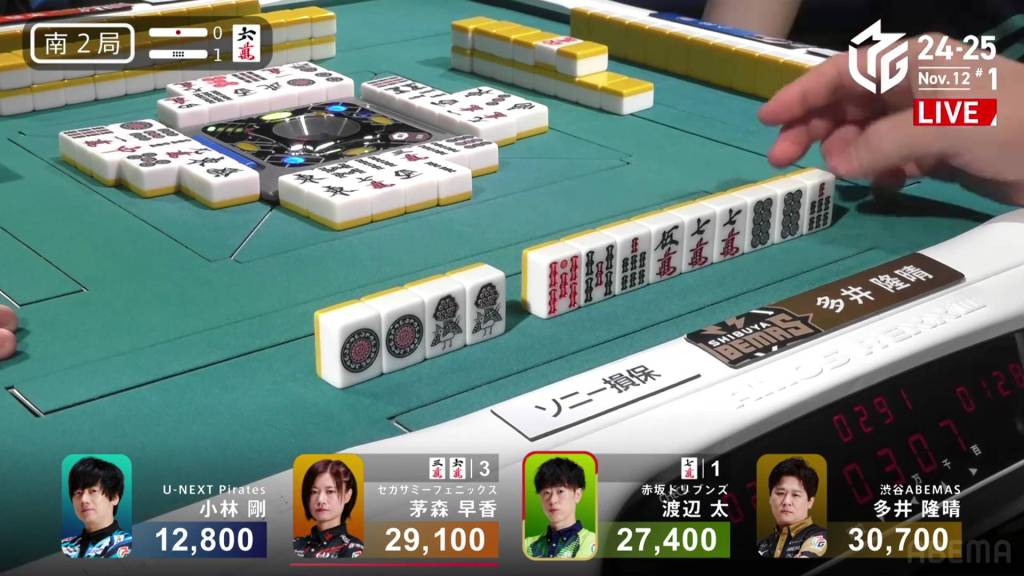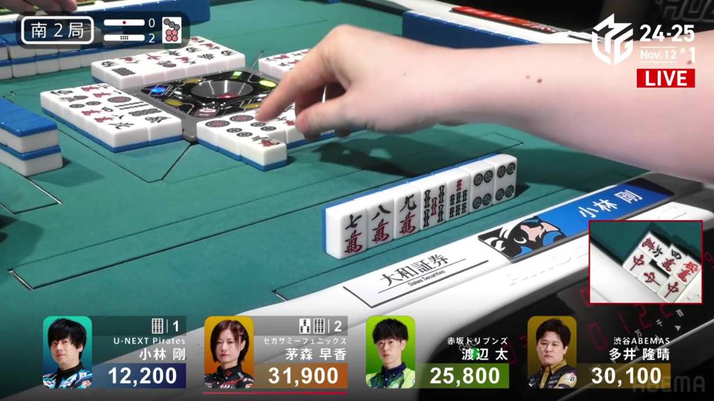 In the end, the hand went to a draw with Kobayashi and Kayamori in tenpai.
