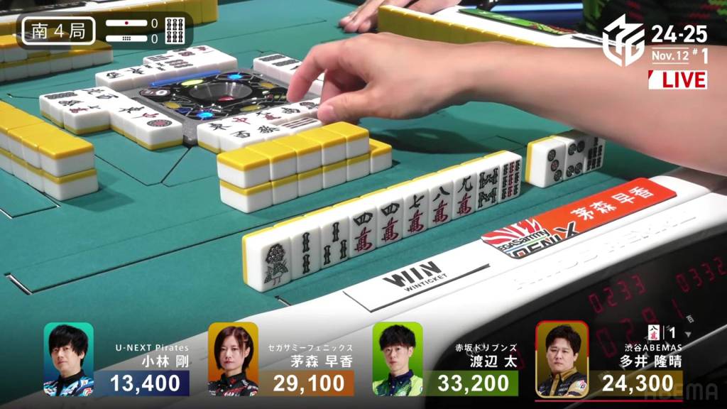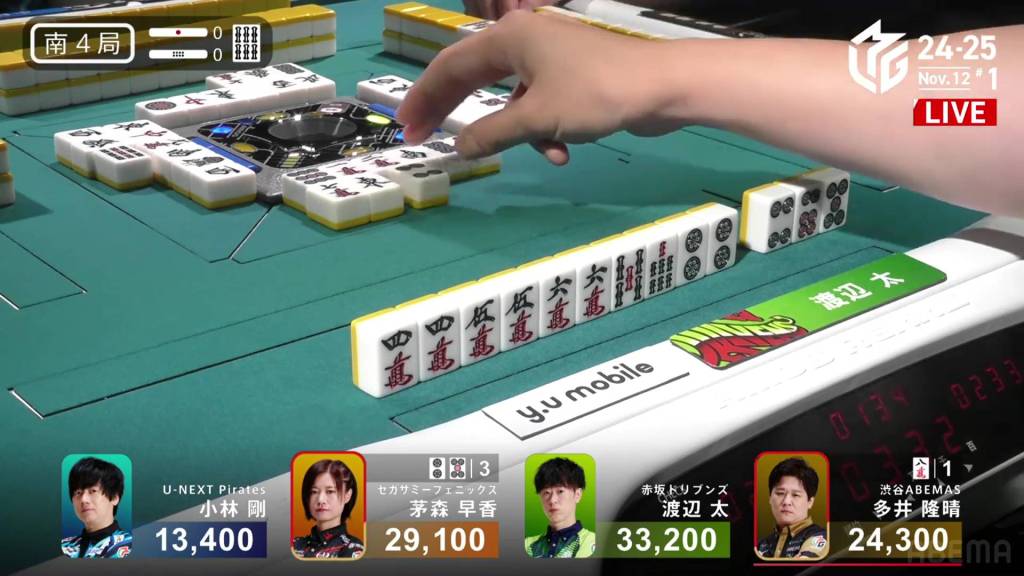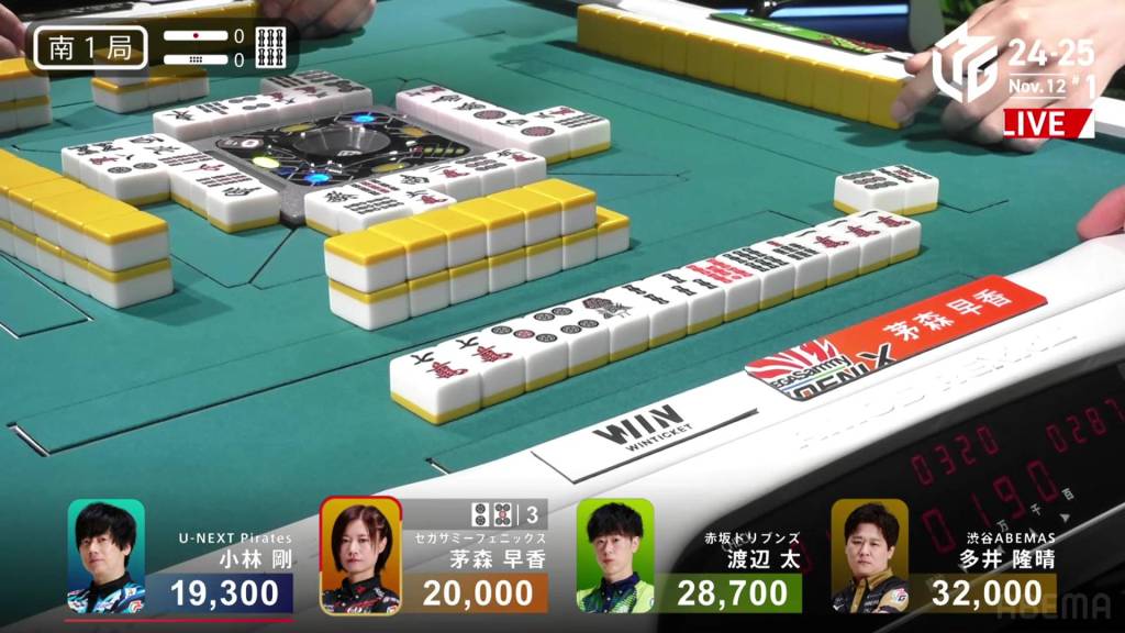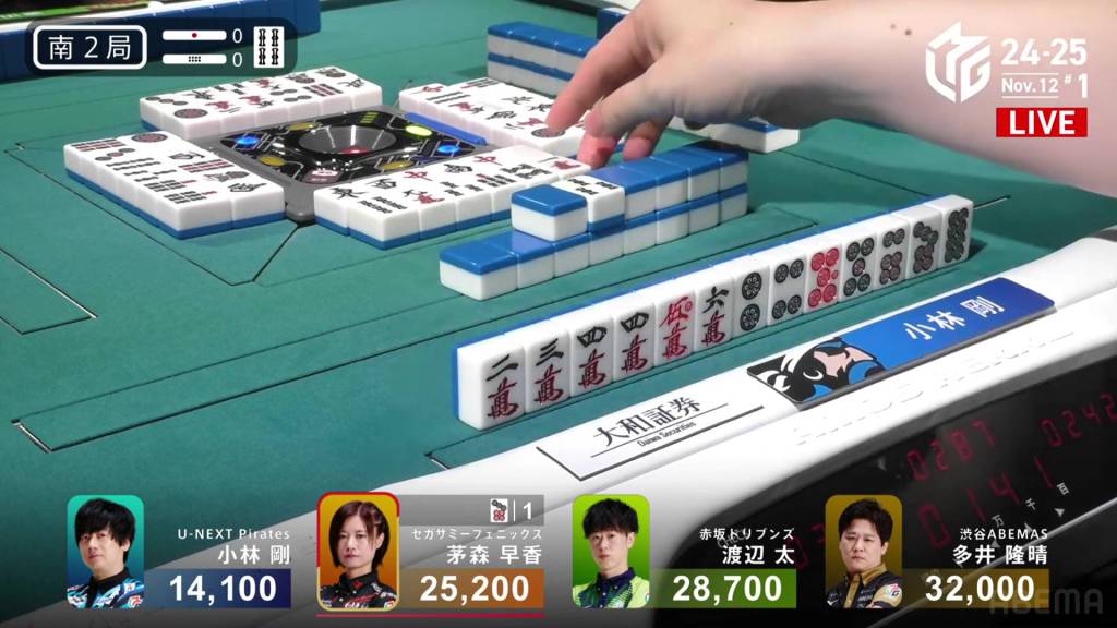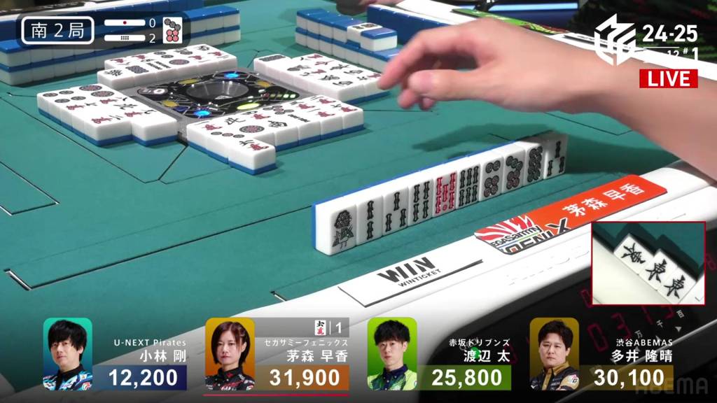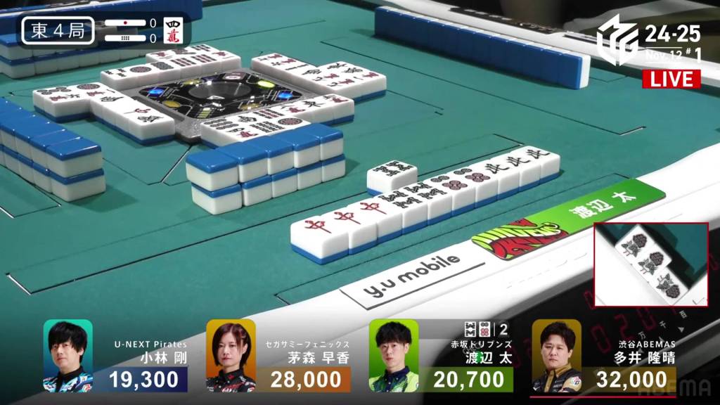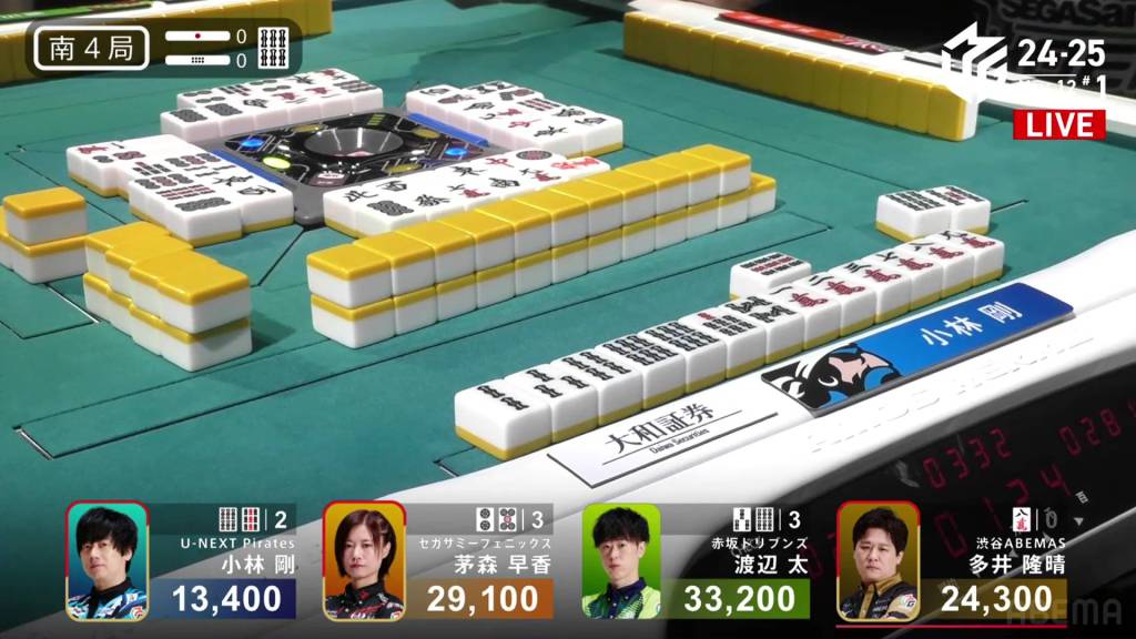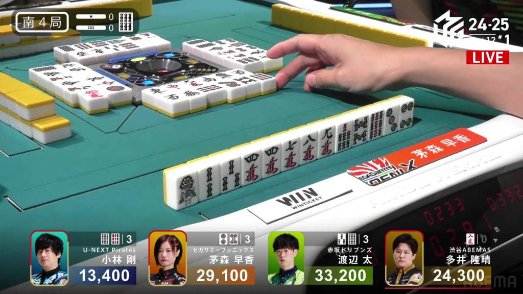 In the end, the hand went to a draw with Kobayashi and Kayamori in tenpai.