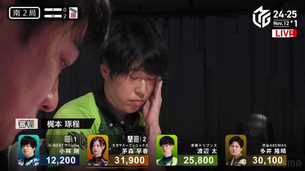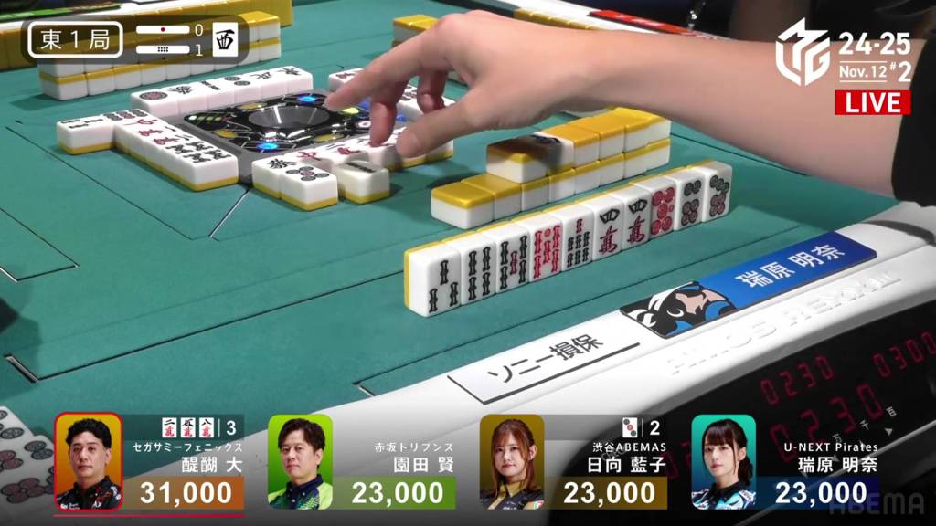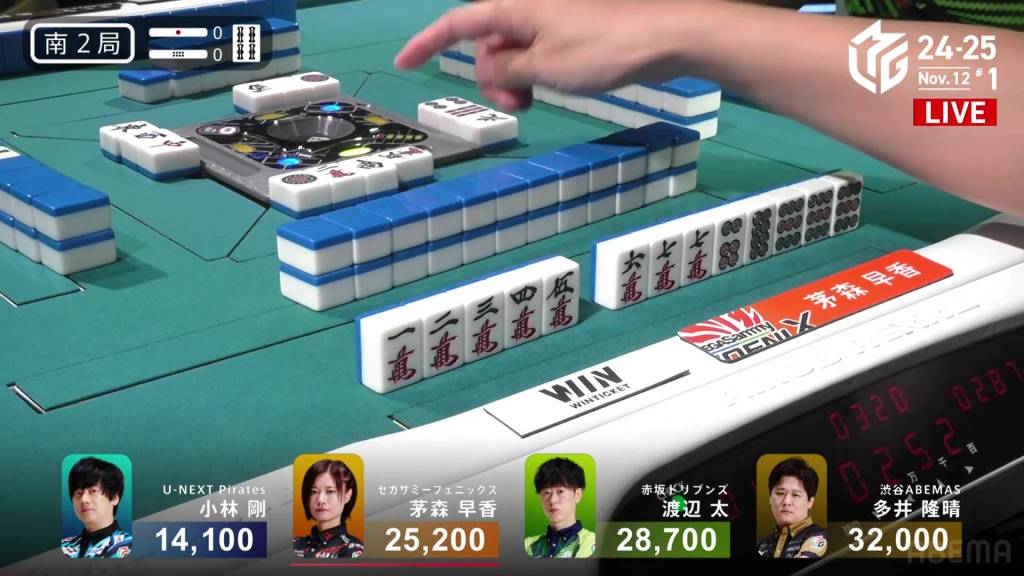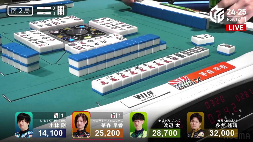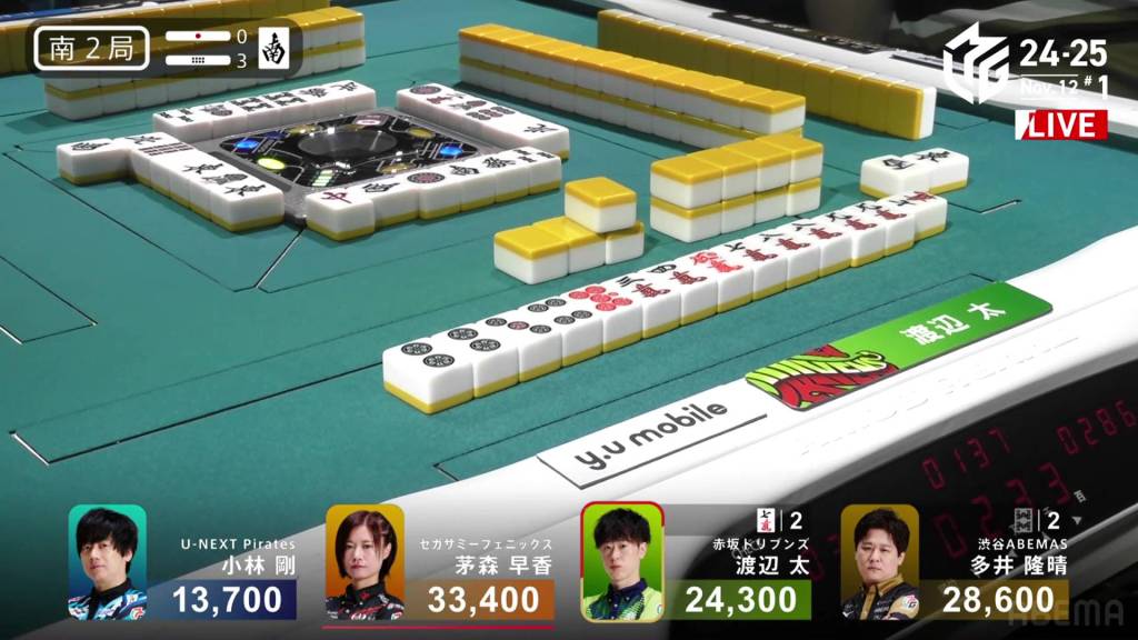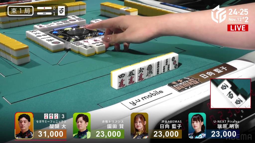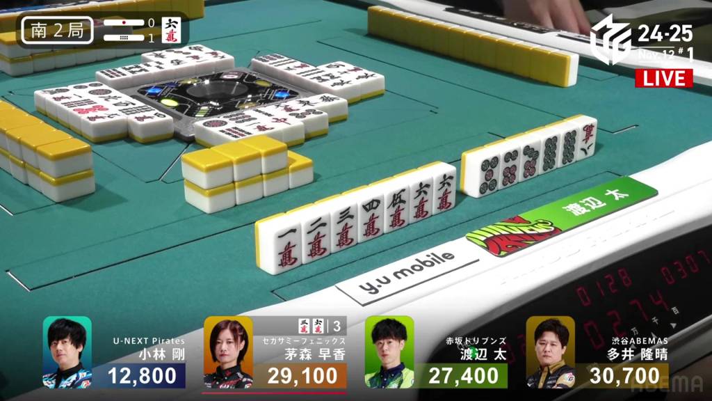 In S1-0, Kayamori is in 3rd place after dealing into a mangan the previous hand. However, she is within 12,000 of 1st place, still within reach of top spot.