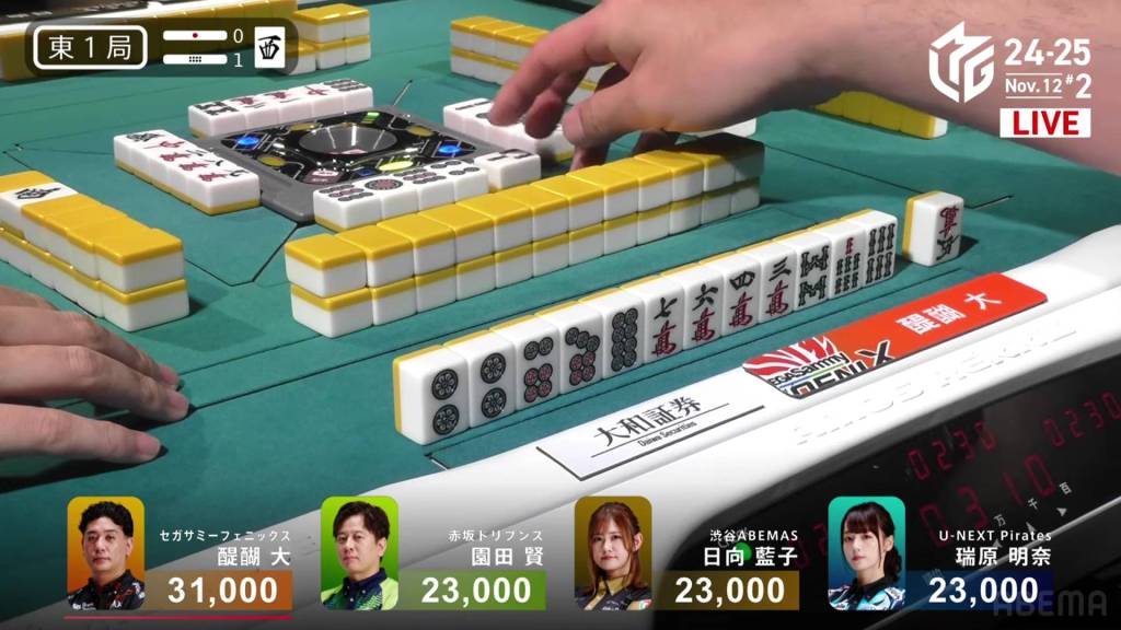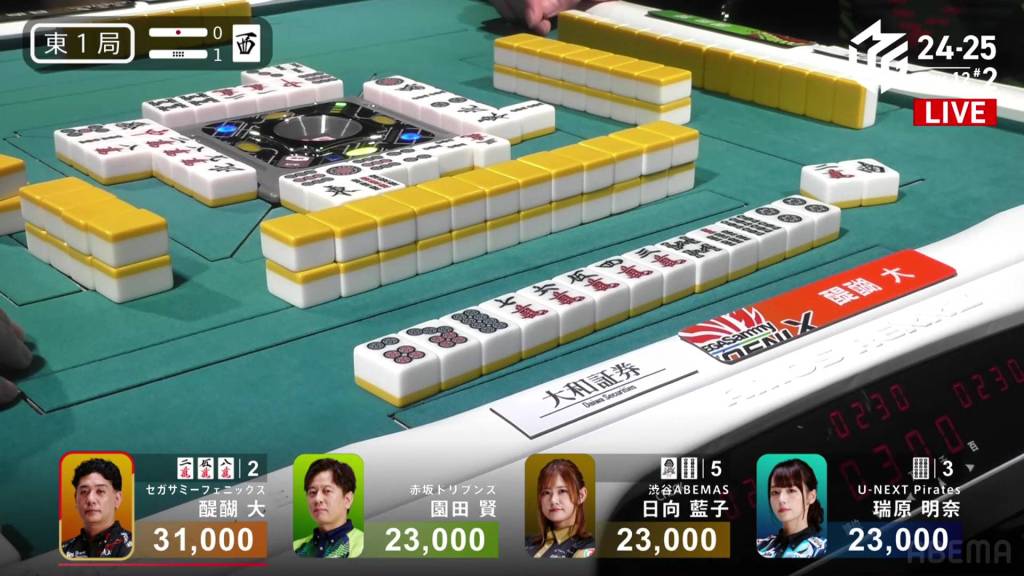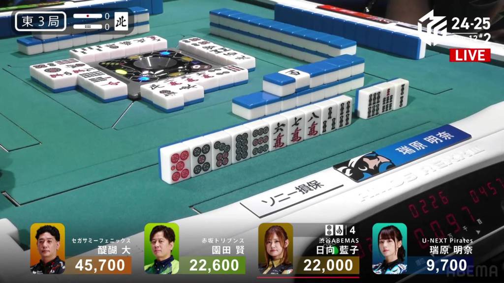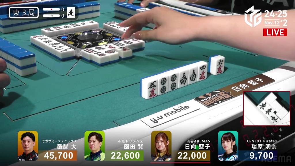 Across the table, we hear a pon. For a moment, commentator Ishibashi thought it was a normal call. Even the Akasaka Drivens’ manager thought it was the right call. But then, everyone realized that Futoshi doesn’t have a 3m pair to call pon with! Futoshi called pon with no ability to complete it!