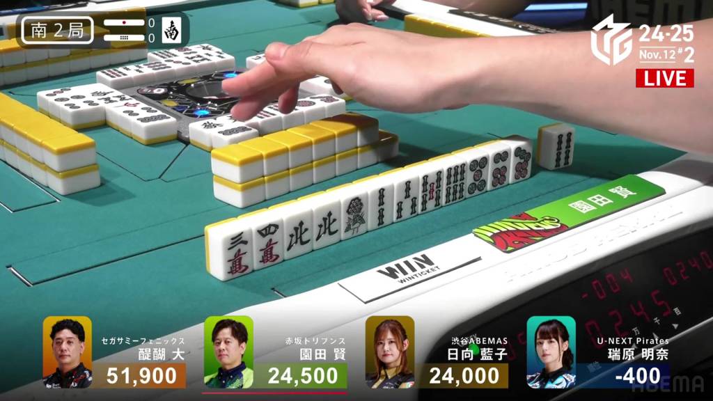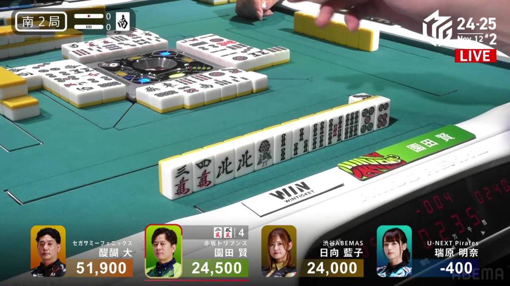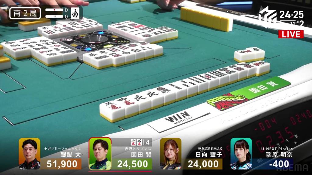 In S2-0, Sonoda is the dealer in 2nd place, 27,400 behind 1st place Daigo. More urgently, he is only 500 ahead of 3rd place Hinata.