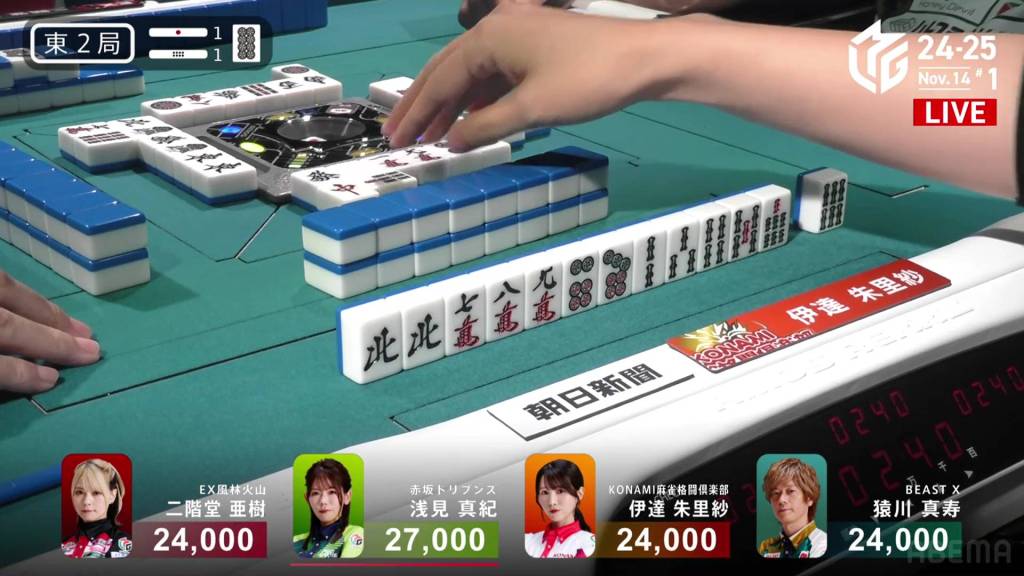 In E2-1, Sarukawa is in a 3-way tie for 2nd place after Asami called riichi and brought the first hand to a draw. As a result, there is a honba and a riichi stick in the pot.