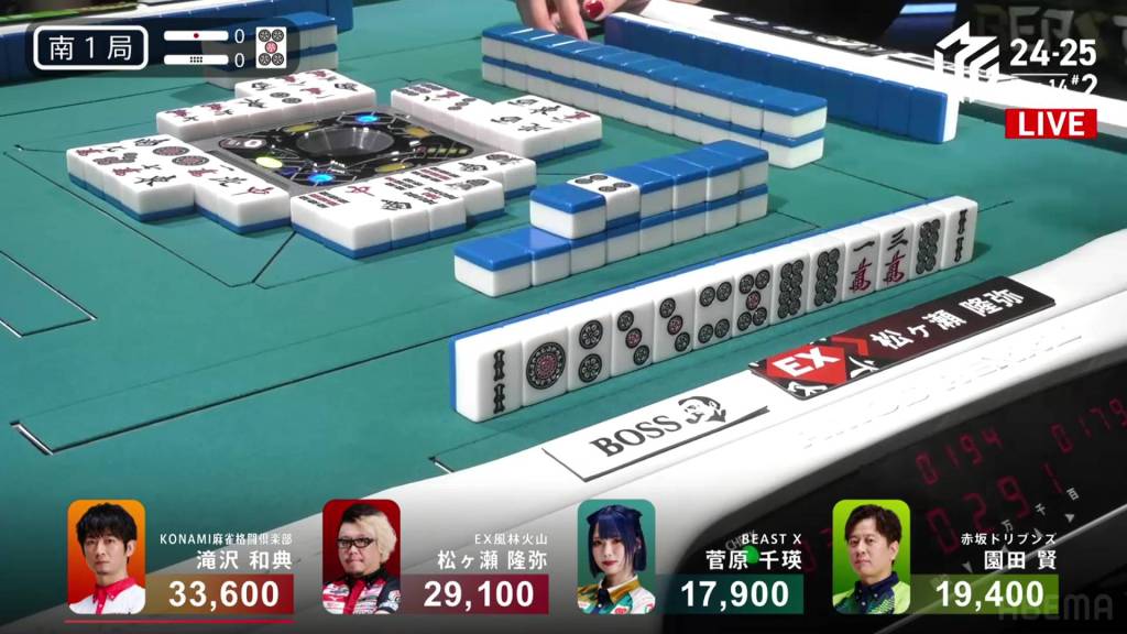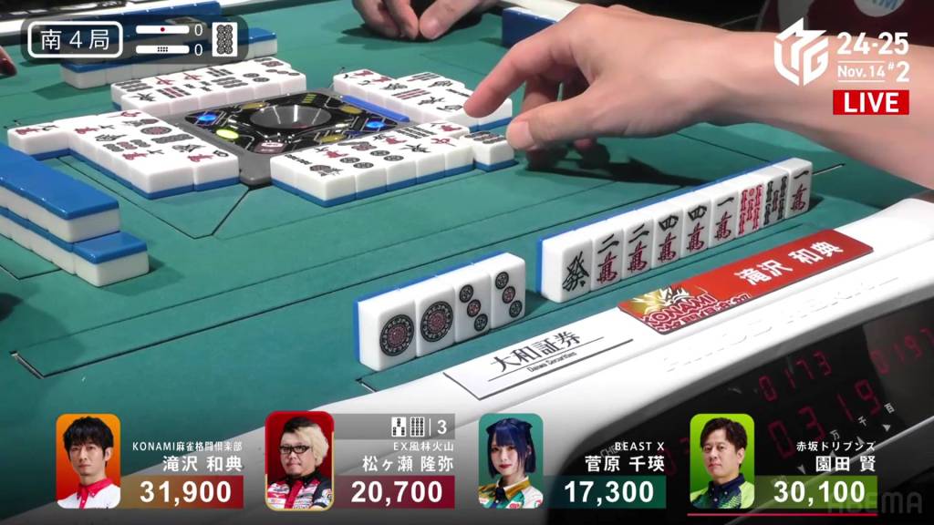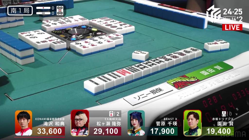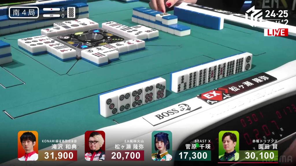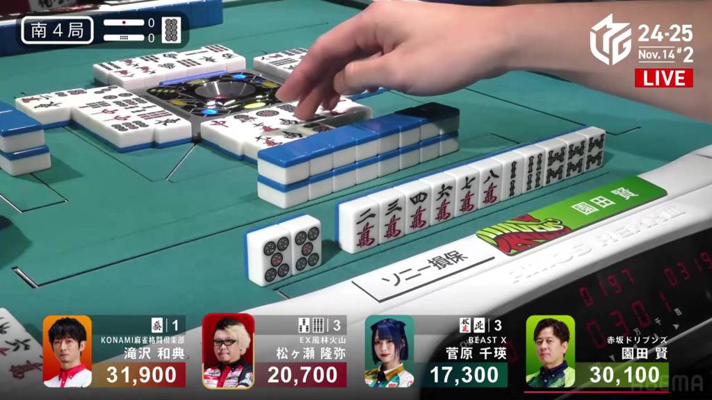 In S4-0, 1st place and 4th place are separated by 14,600. This means that a haneman tsumo would get 4th place Sugawara into 1st place. Sitting in 3rd place is Matsugase, who is 9,400 behind 2nd place dealer Sonoda and 11,200 behind 1st place Takizawa.