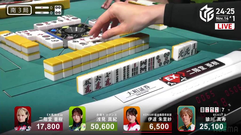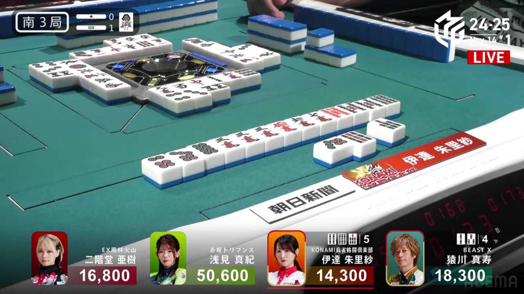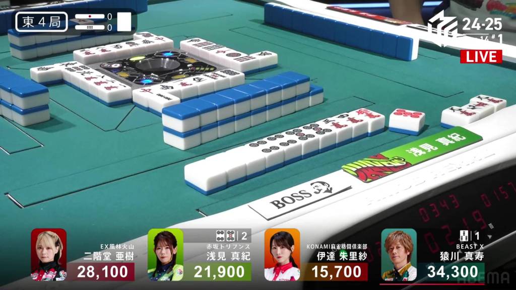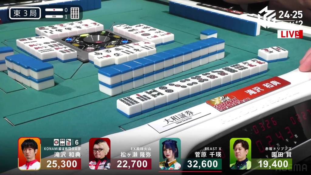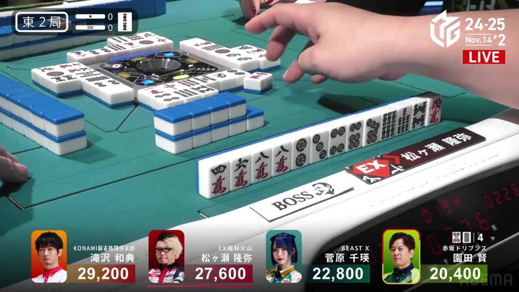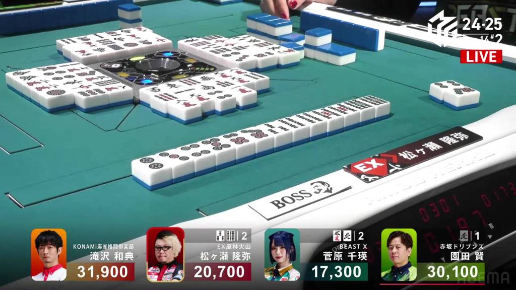 In S4-0, 1st place and 4th place are separated by 14,600. This means that a haneman tsumo would get 4th place Sugawara into 1st place. Sitting in 3rd place is Matsugase, who is 9,400 behind 2nd place dealer Sonoda and 11,200 behind 1st place Takizawa.