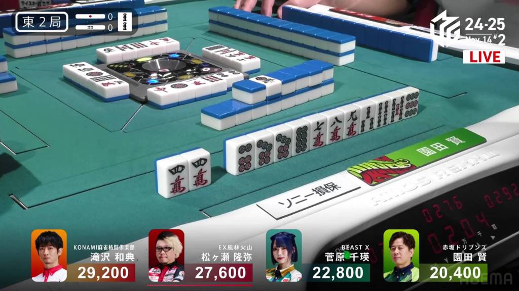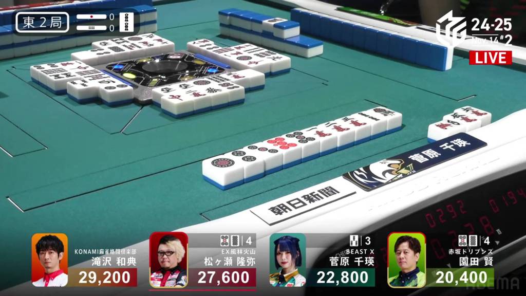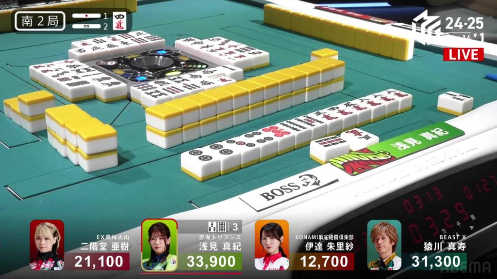 In S2-2, Asami is the dealer in 1st place, but followed closely by Sarukawa who is just 2,600 behind. A riichi stick and two honba are in the pot.