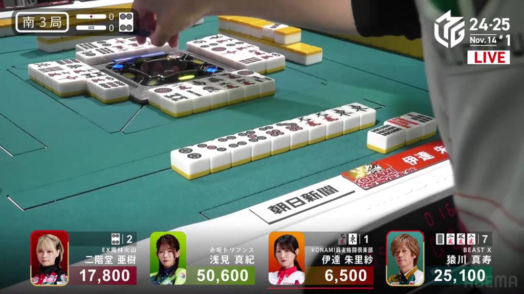 At the end of the second row, Asami draws the ideal 3s and wins the hand. Asami wins with Riichi/Tsumo/Tanyao/Sanshoku/Dora 1/Aka 1 for a big 6,000+200 all plus a riichi stick.