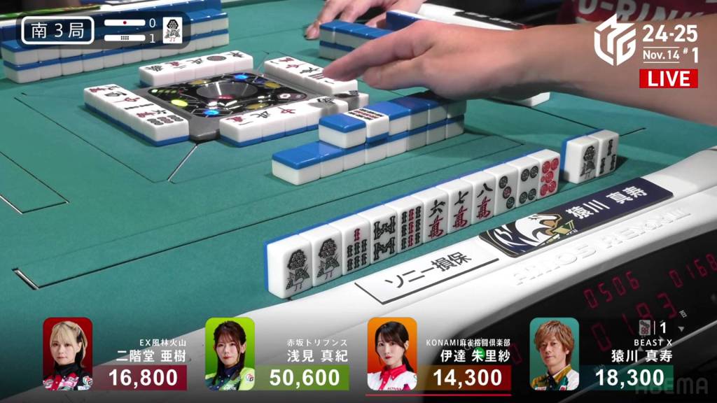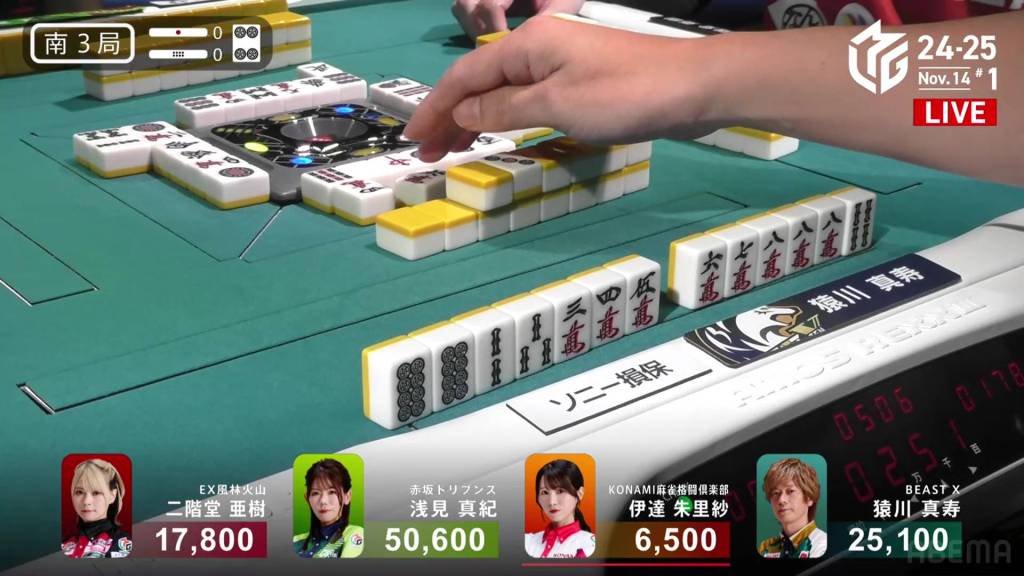 Right after, 2nd place Sarukawa tries to stop the table’s progress by calling riichi and waiting on a 23s wait.