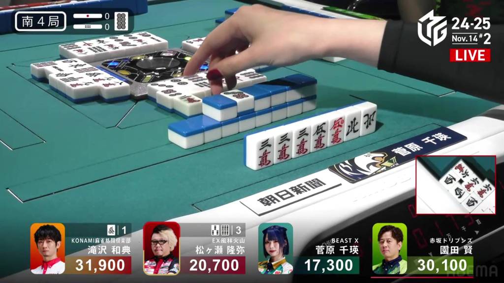 Right after, Sugawara pairs up the north to get to tenpai on a 5m/north shanpon. With Honitsu/Toitoi/Aka 1 guaranteed, drawing a north to add a yakuhai will actually give her haneman and a surprise 1st place.