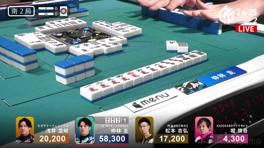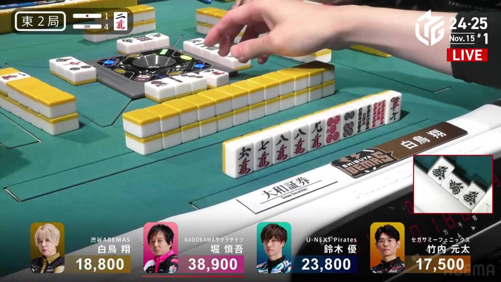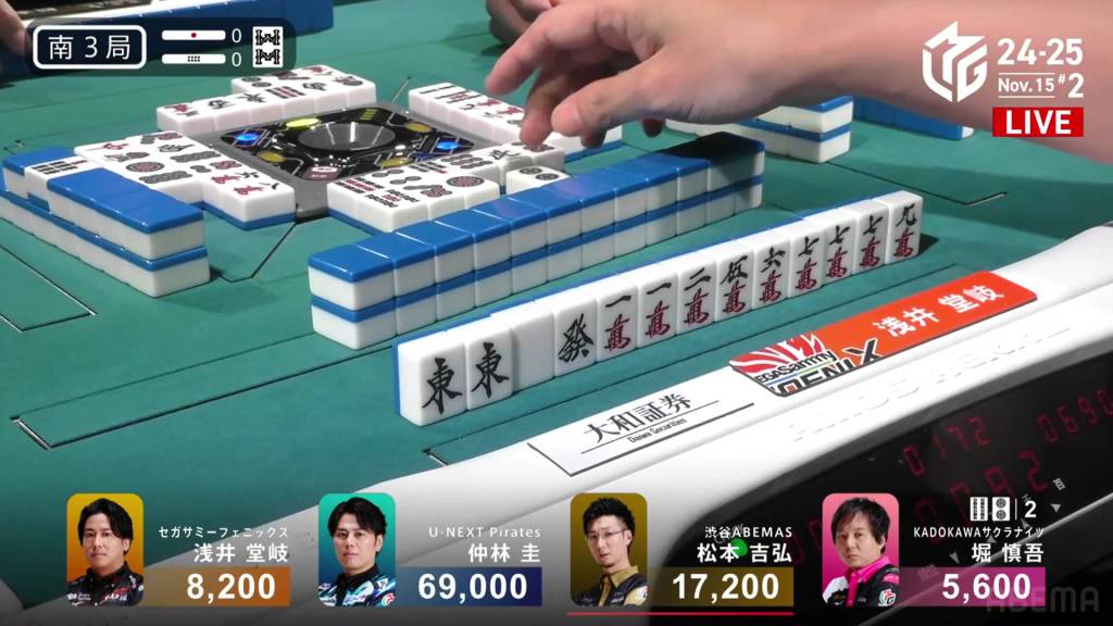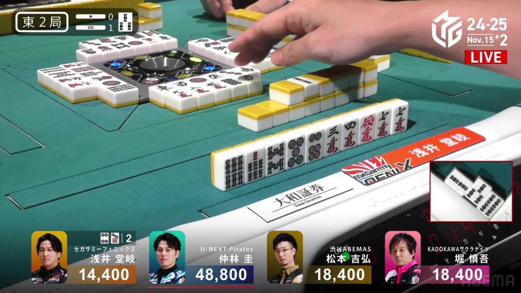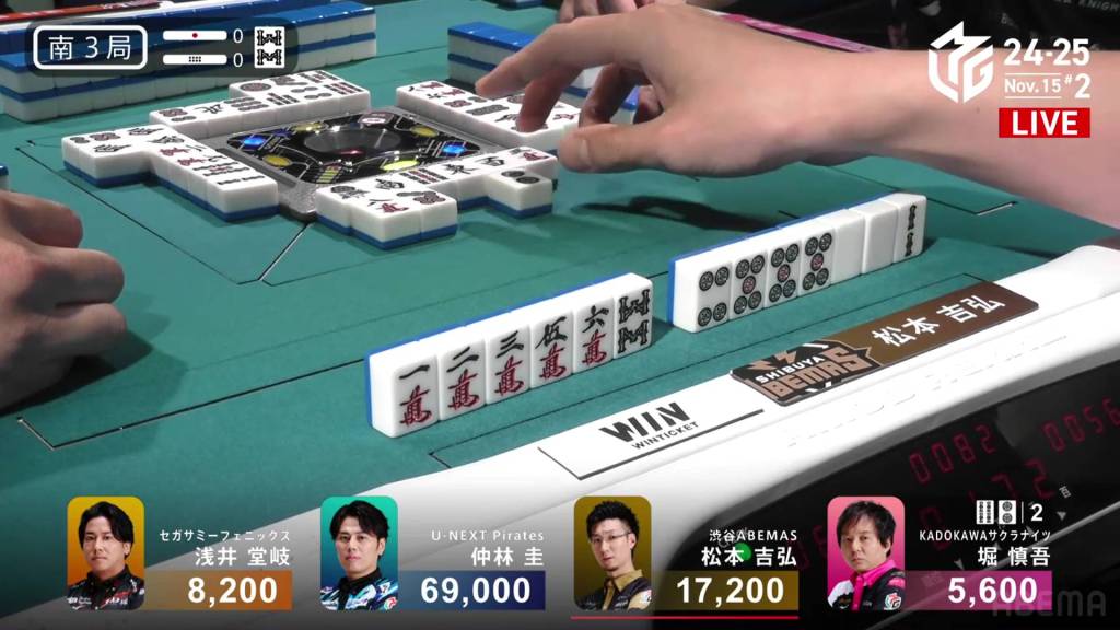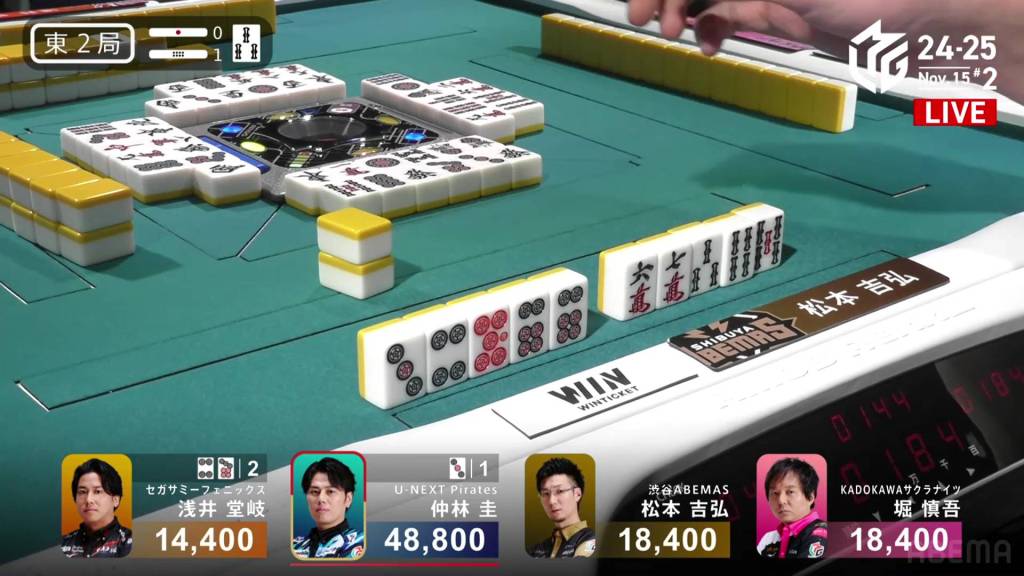 With Matsumoto’s riichi tile, Hori calls chii to improve his wait to a 58s ryanmen. But, on Hori’s next turn, he draws and discards the 3m and deals into Matsumoto. With the uradora flip, both his 2s triplet and the 4m in his hand become uradora, more than doubling his hand’s value. Matsumoto wins the hand with Riichi/Tanyao/Dora 1/Ura 4 for 12,000, a big direct hit off his rival.