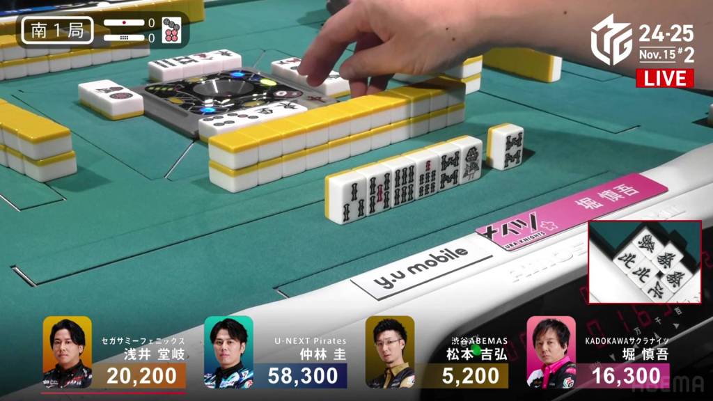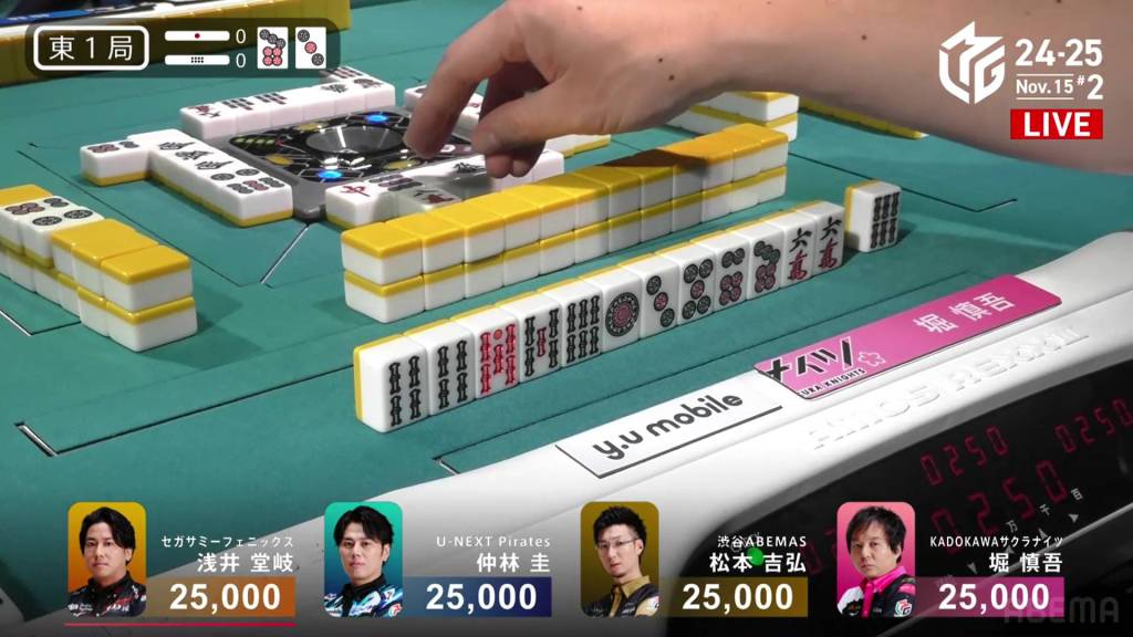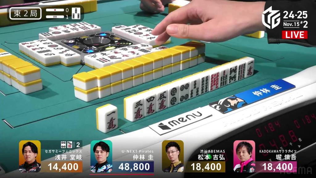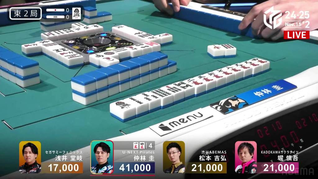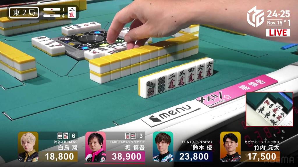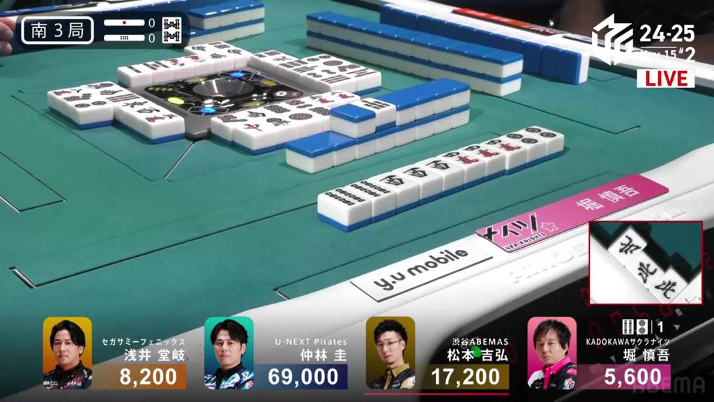 With Matsumoto’s riichi tile, Hori calls chii to improve his wait to a 58s ryanmen. But, on Hori’s next turn, he draws and discards the 3m and deals into Matsumoto. With the uradora flip, both his 2s triplet and the 4m in his hand become uradora, more than doubling his hand’s value. Matsumoto wins the hand with Riichi/Tanyao/Dora 1/Ura 4 for 12,000, a big direct hit off his rival.