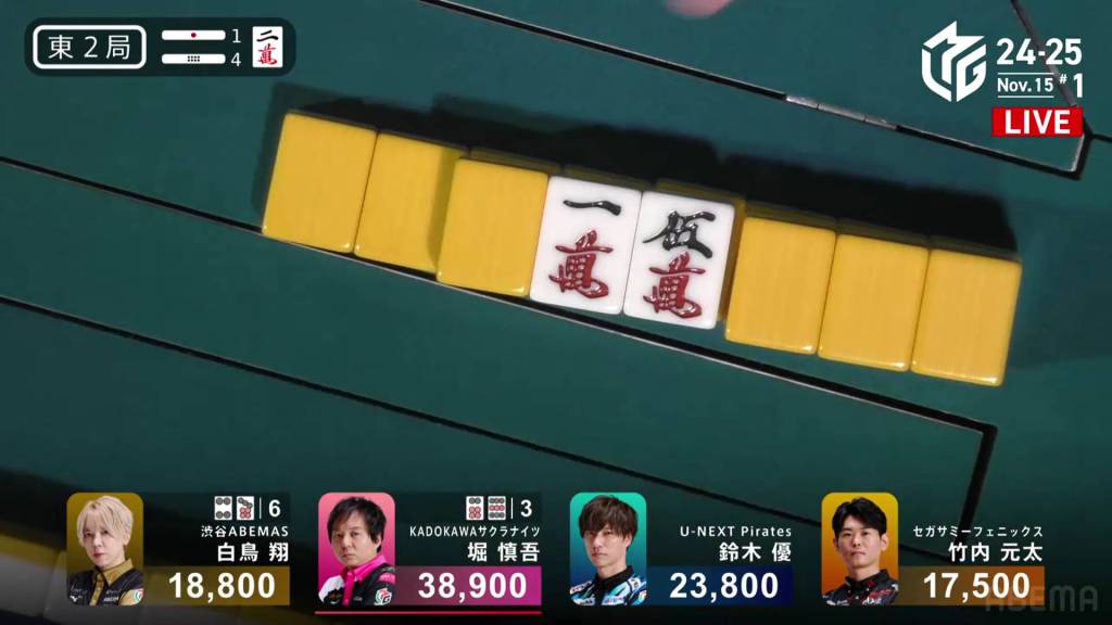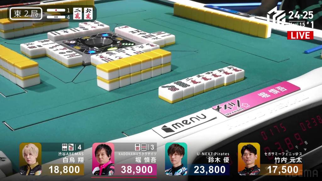 In E2-4, Hori is the dealer in 1st place after a series of small wins and hands going to a draw. Four honba and a riichi stick are in the pot.