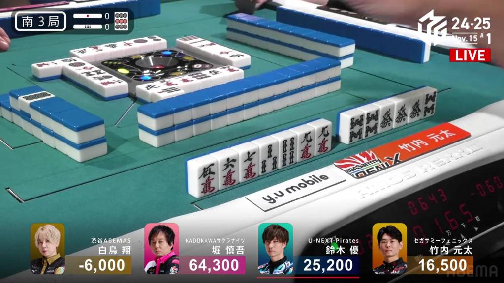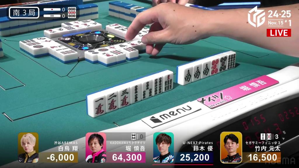 Out to challenge the wrath of Hori is 3rd place Shiratori. With a green dragon pon and completing a sequence in the first row, Shiratori is the first to tenpai and waits on a 47p ryanmen.