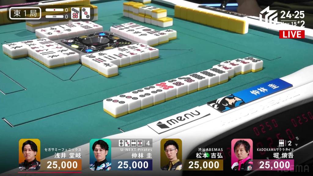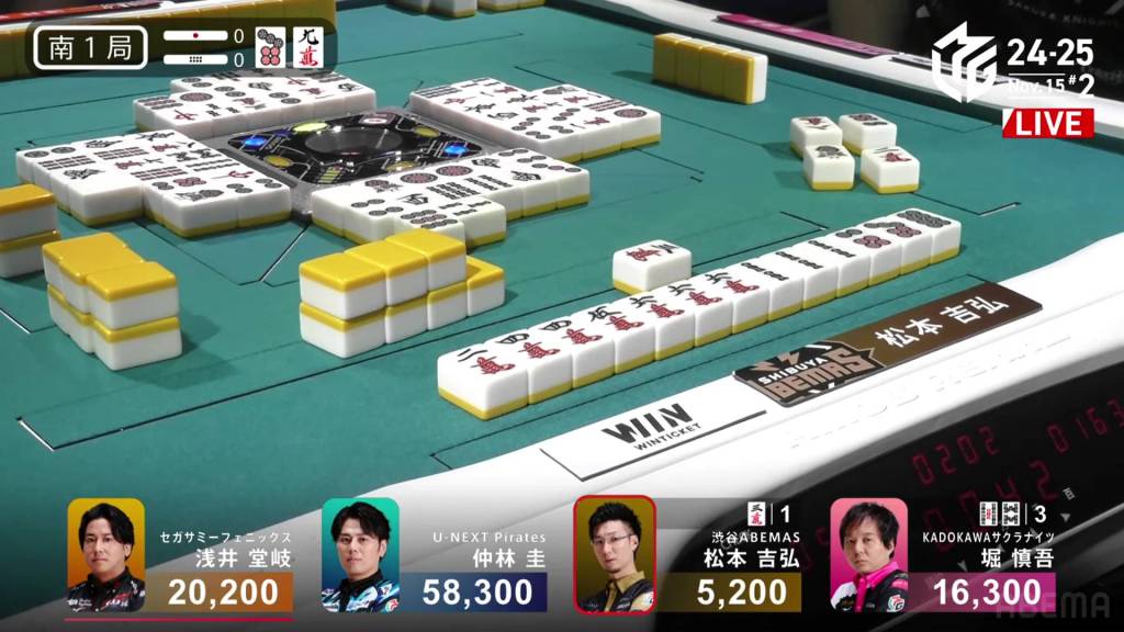 At the start of the second row, Matsumoto exchanges his 3p for a 6p and ends up dealing into Nakabayashi. Hitting the uradora, Nakabayashi wins with Riichi/Dora 1/Aka 1/Ura 1 for 12,000+300. With the win, Nakabayashi is now at 61,100 within the first quarter of the game.