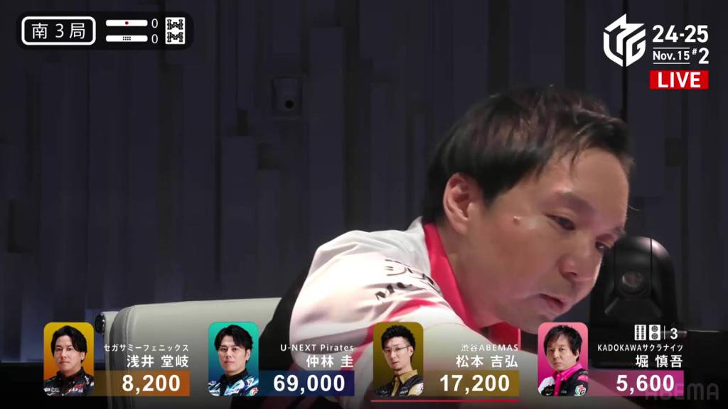 But, Hori does not call ron! With just the toitoi, it would only be worth 2,600, tying him with Takaki. With Hori having the last dealership, he would be at a disadvantage because any tsumo by his opponents would put him in 4th place. With still some time left, Hori can afford to wait. If he draws a winning tile, he would move into 2nd. If the hand goes to a draw and Takaki is noten, the would actually gain more points and end up sole 3rd.
