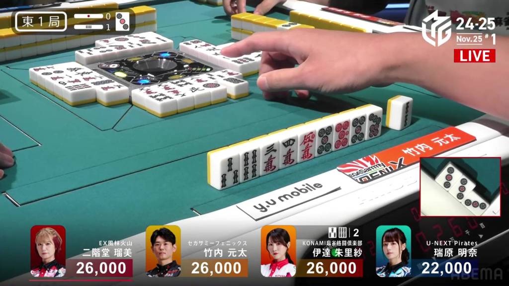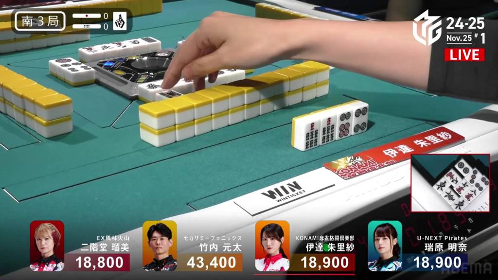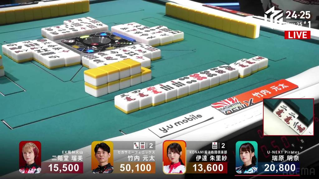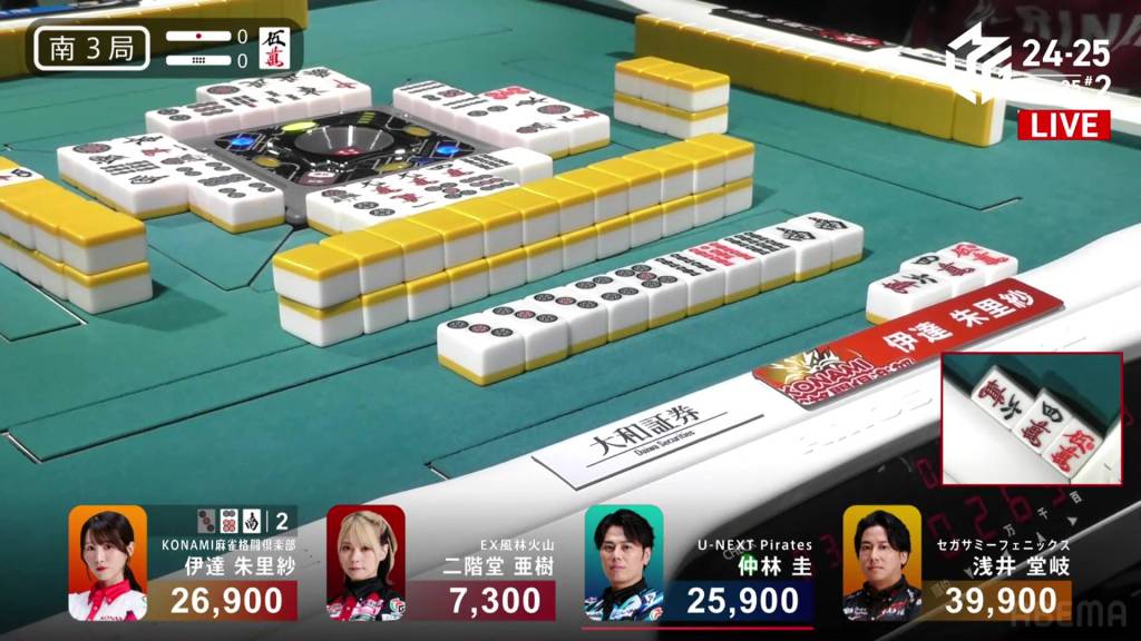 In E3-2, Mizuhara is still trying to recover after dealing into a mangan early in the game. She sits 16,300 behind the 2nd place tie.
