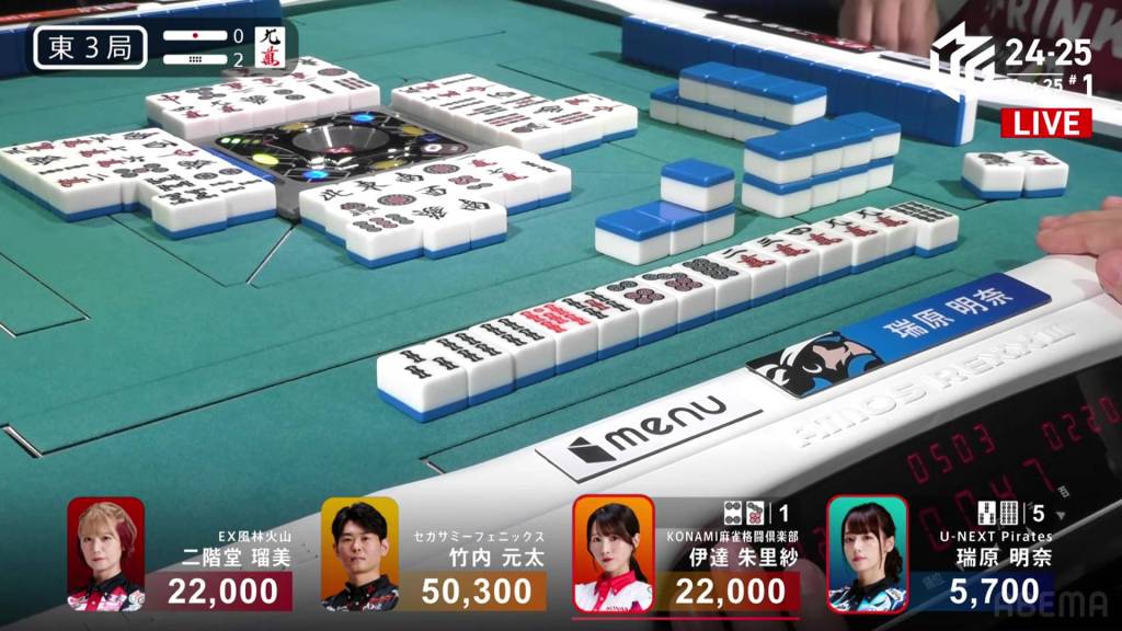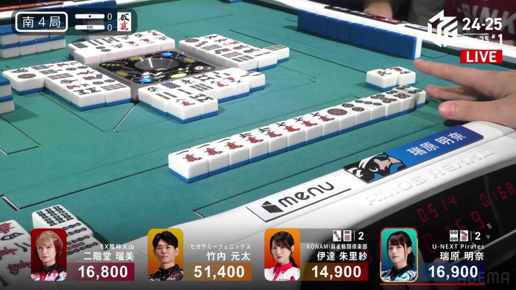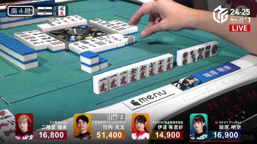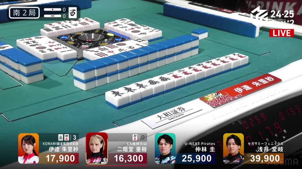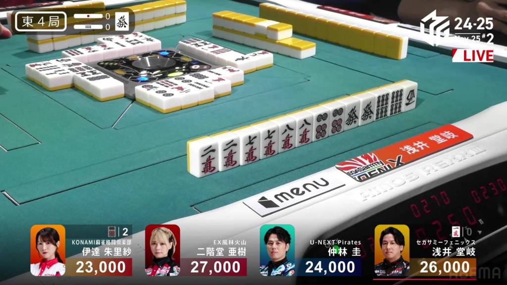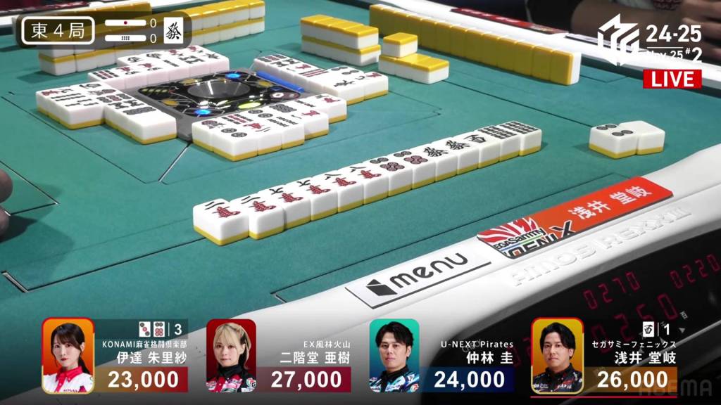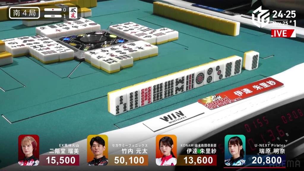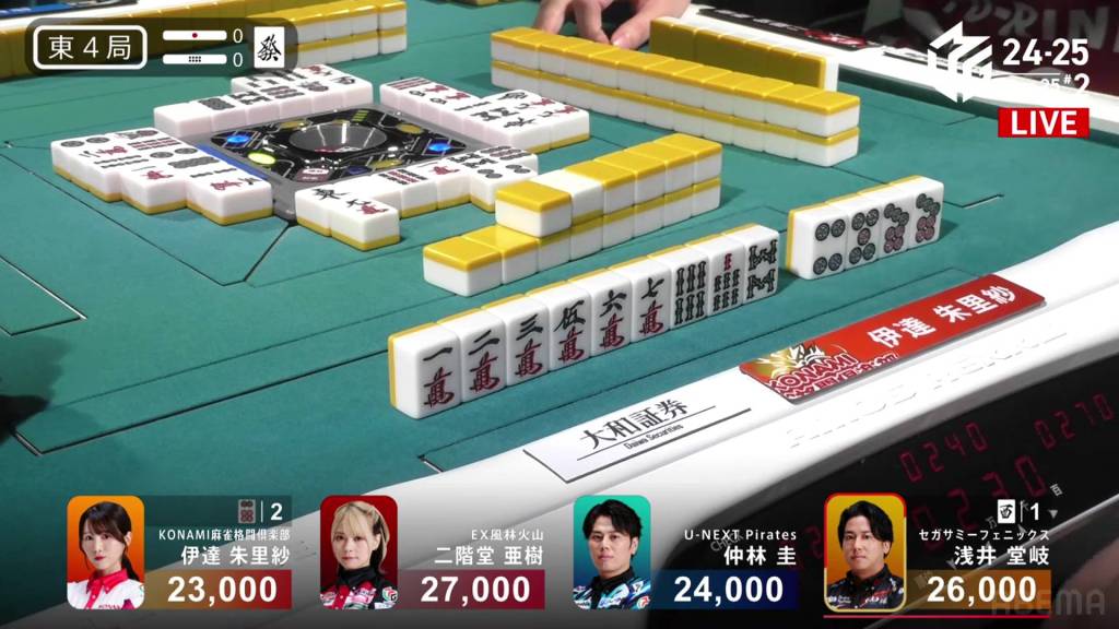 After a bunch of small hands, the scores are close between the four players, with 1st place and 4th place separated by only 4,000. Sitting in 2nd place is the dealer Takaki, 1,000 behind 1st place Aki.