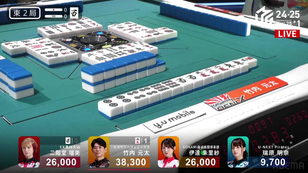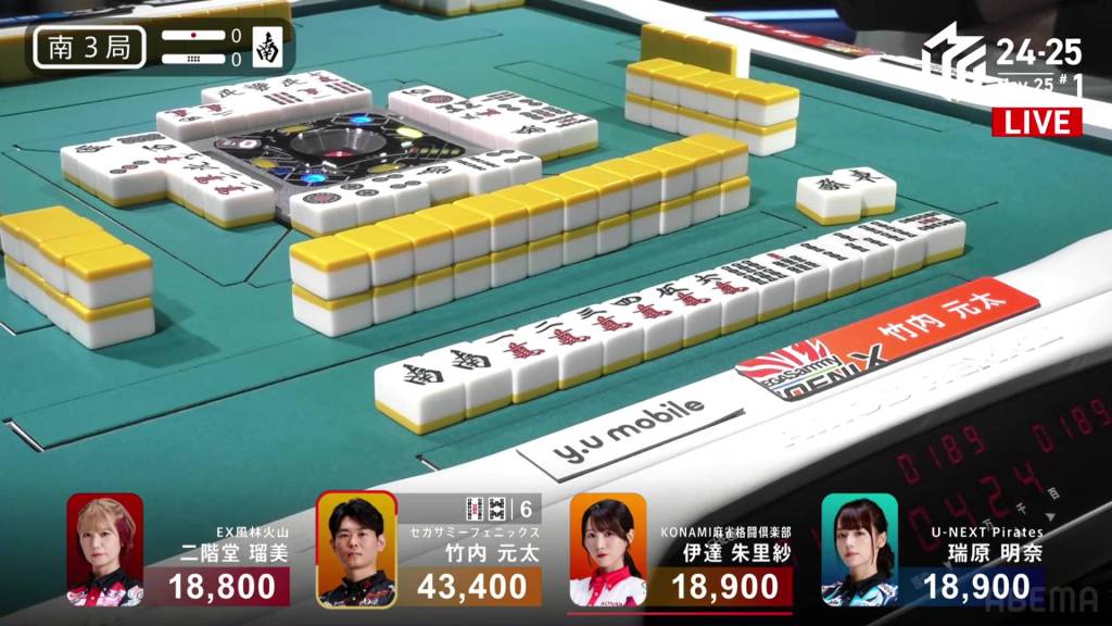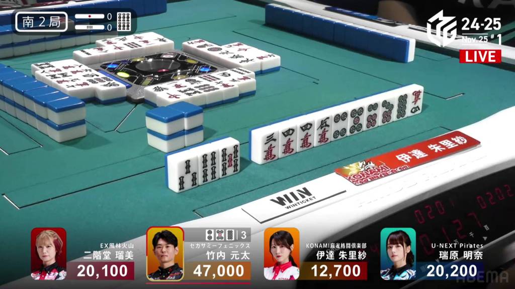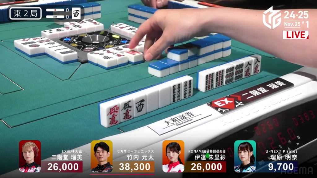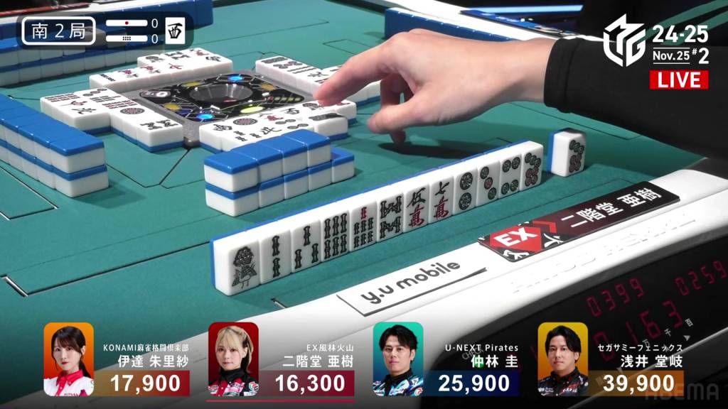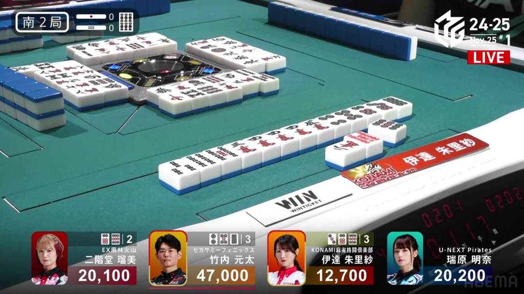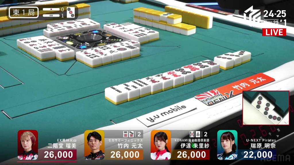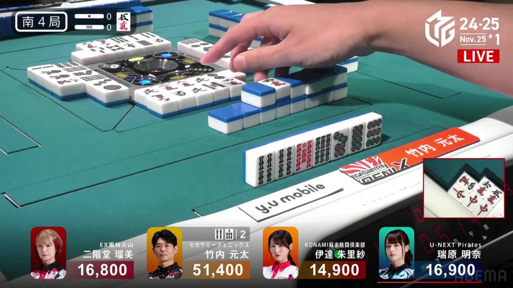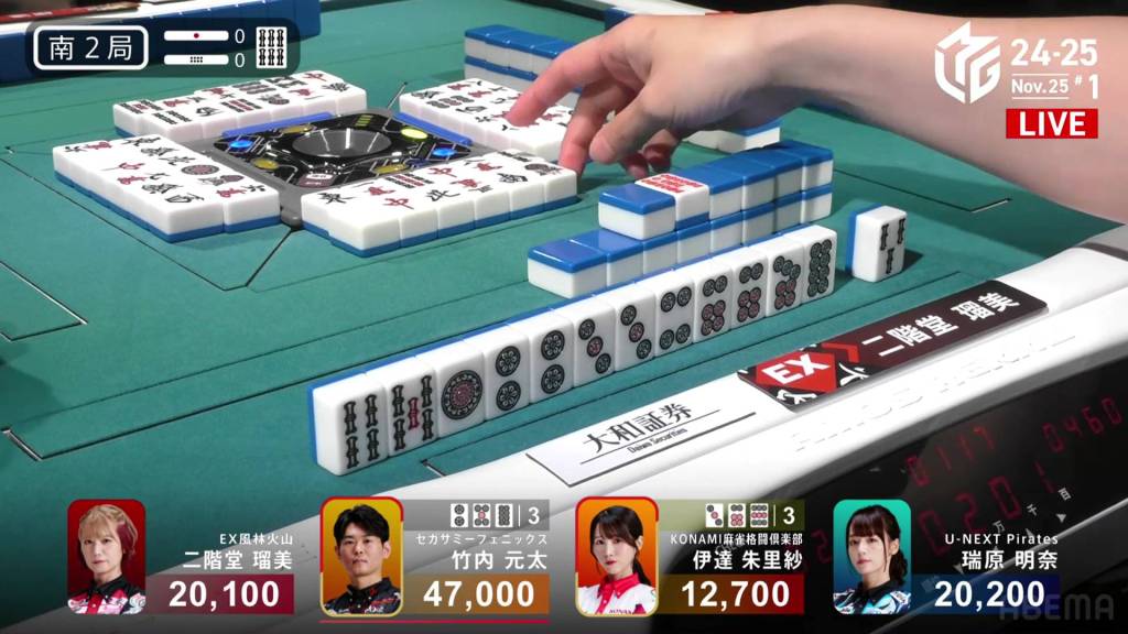 After a bunch of small hands, the scores are close between the four players, with 1st place and 4th place separated by only 4,000. Sitting in 2nd place is the dealer Takaki, 1,000 behind 1st place Aki.