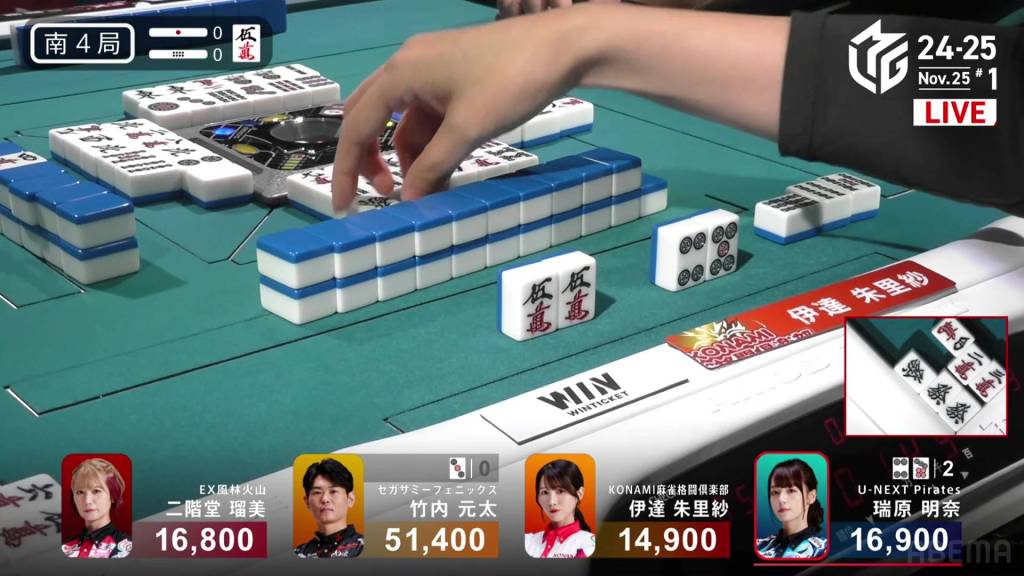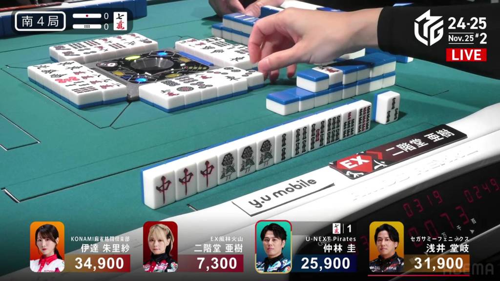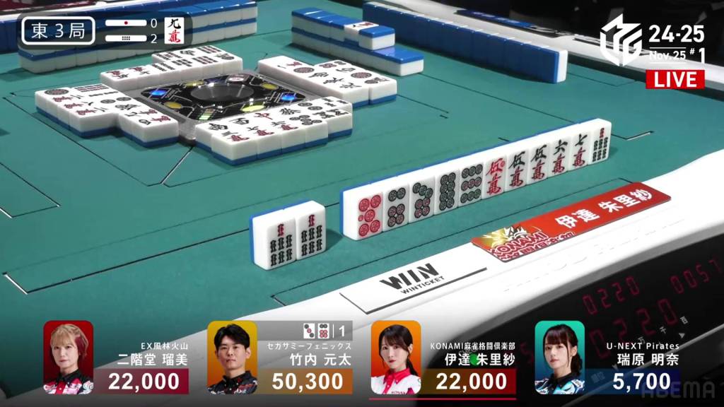 It’s 1 vs. 1. It’s either 1st or 4th for Nakabayashi. Then, at the start of the second row, Nakabayashi draws the 7m and wins the hand! Nakabayashi wins with Riichi/Tsumo/Dora 1/Aka 1/Ura 1 for 2,000/4,000 plus Aki’s riichi stick, winning the game.