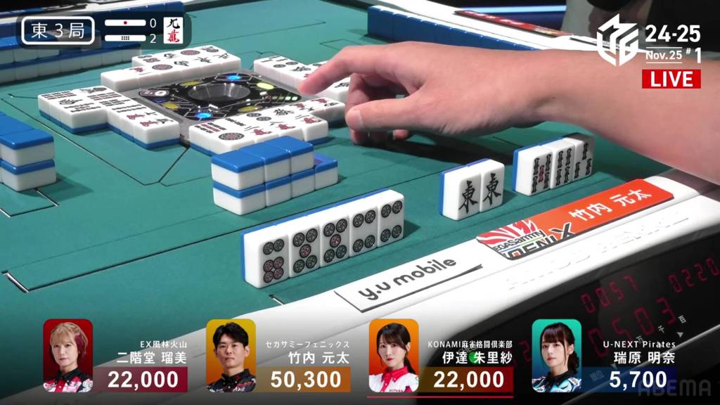 During the ippatsu round, Date pairs up the green dragon to get to tenpai and waits dama on a green dragon/4m shanpon. If she wins with the green dragon, she will have a mangan. Soon after, Aki discards the green dragon and deals into Date. Date wins the hand with Honitsu/Green Dragon for 8,000 plus Aki’s riichi stick, moving her into 2nd place.