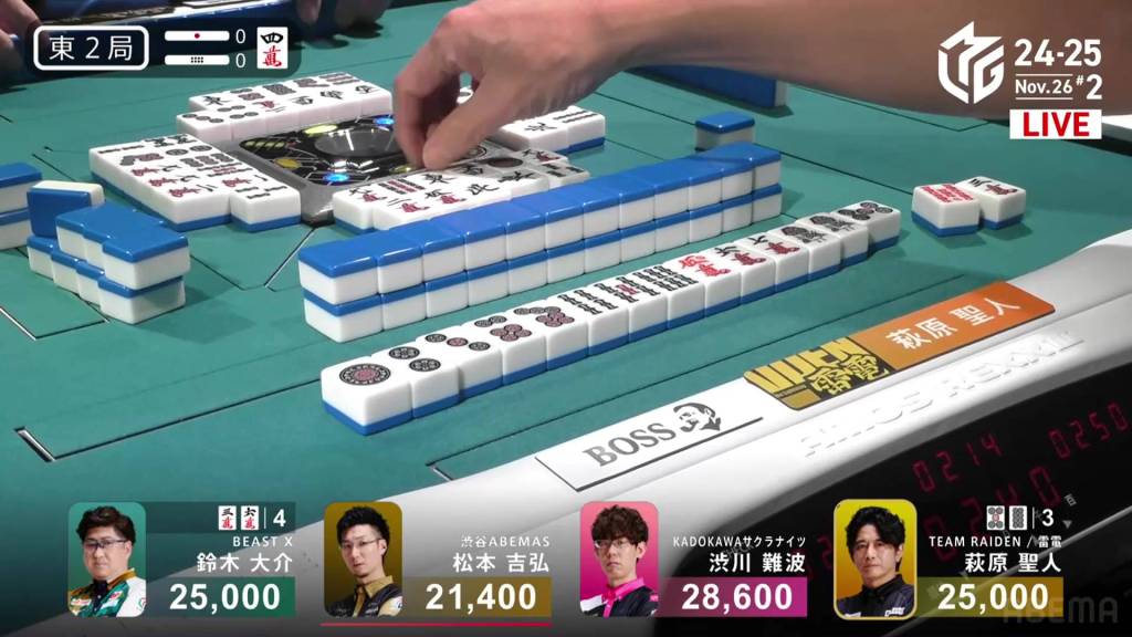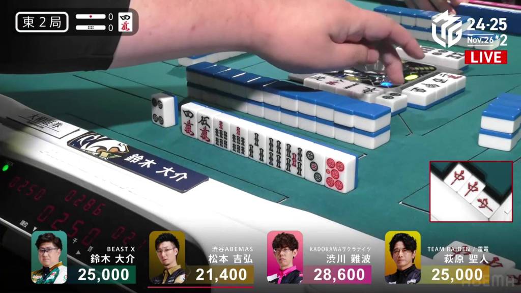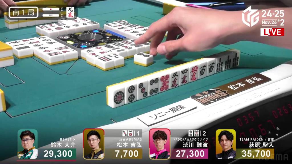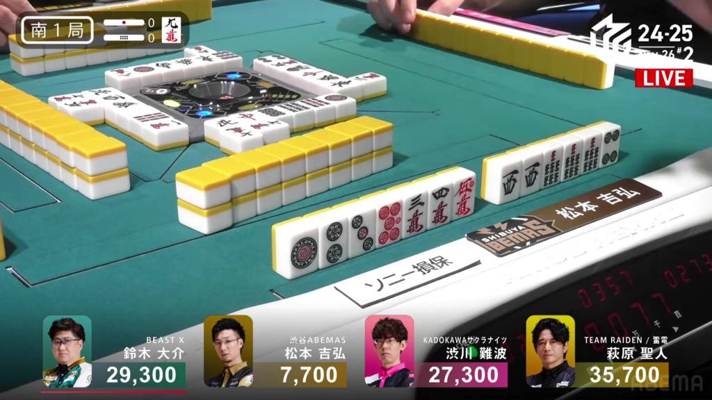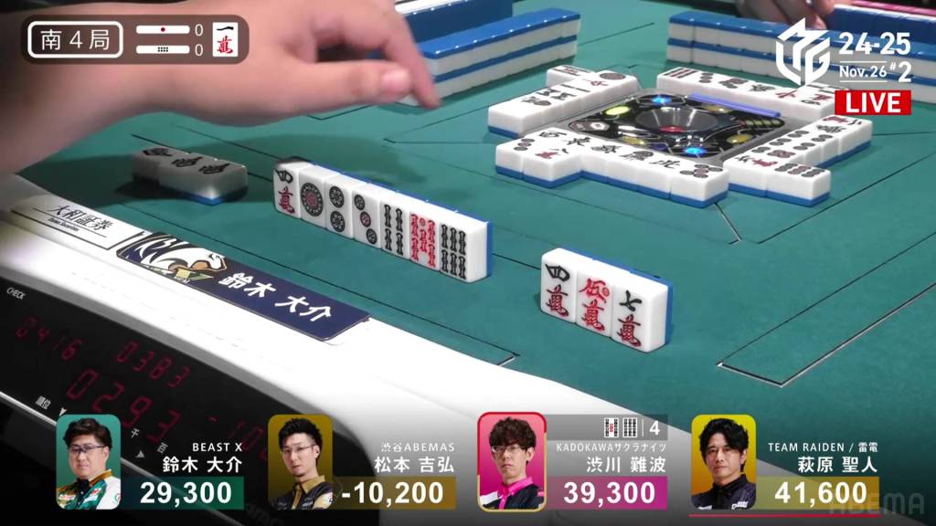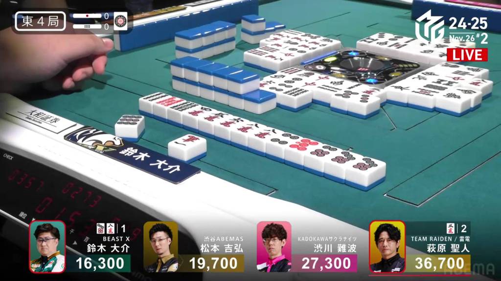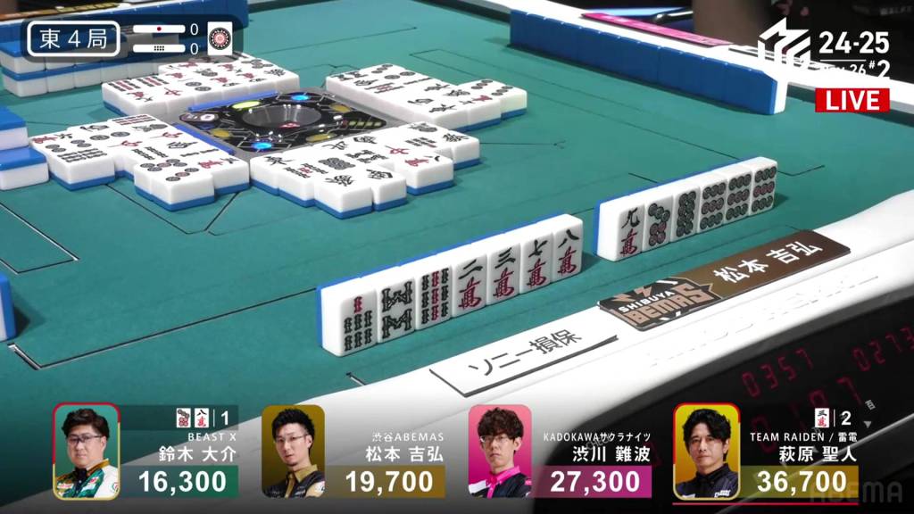 Playing for the Shibuya Abemas in the second game is Matsumoto Yoshihiro, who is currently without a 1st place despite playing 11 games so far this season. After Ooi’s win in the previous game, Matsumoto hopes that momentum carries over to him. So far, things haven’t gone as well as he had hoped, dealing in while in riichi during E1-0, then losing his riichi in E3-0.