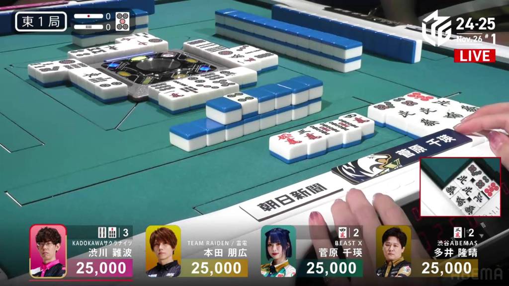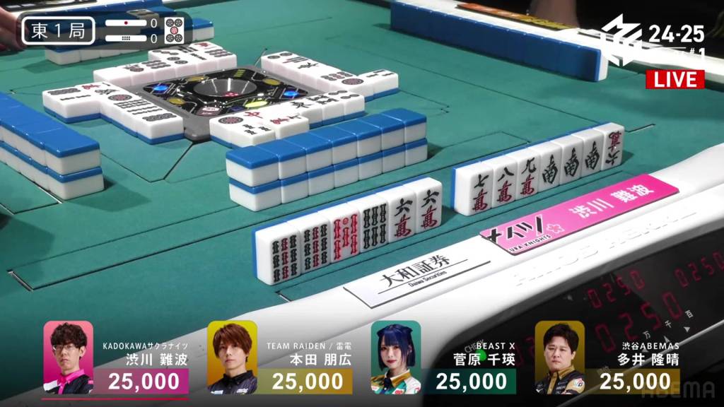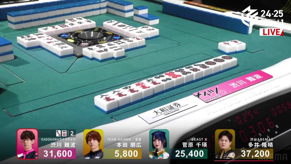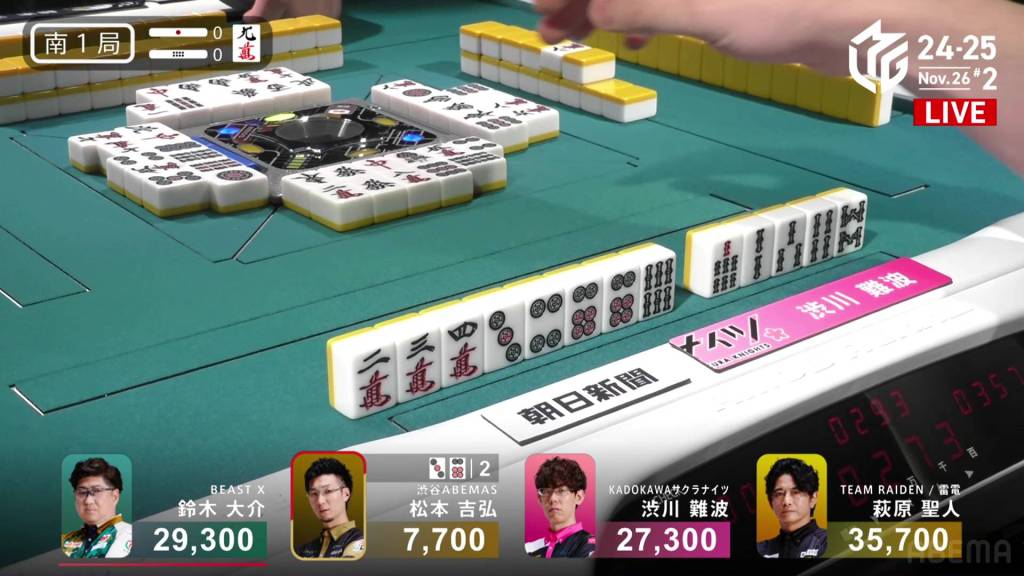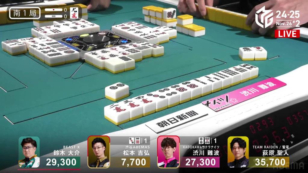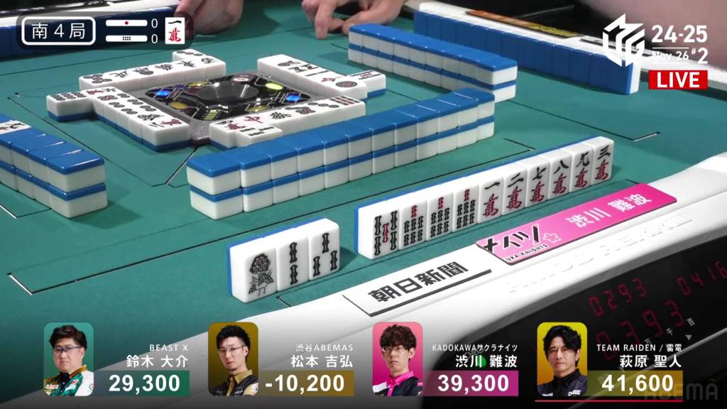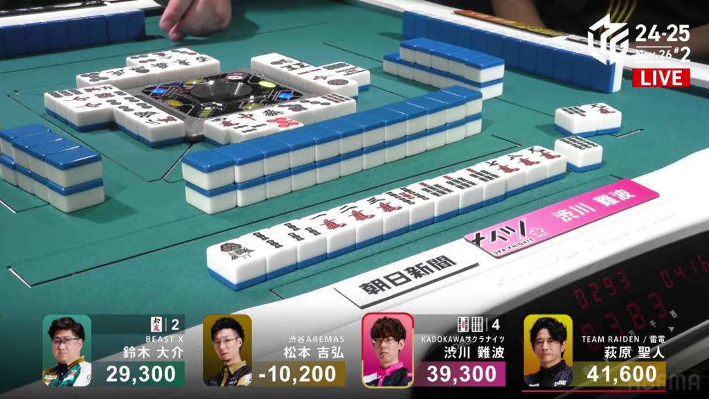 Playing for the Shibuya Abemas in the second game is Matsumoto Yoshihiro, who is currently without a 1st place despite playing 11 games so far this season. After Ooi’s win in the previous game, Matsumoto hopes that momentum carries over to him. So far, things haven’t gone as well as he had hoped, dealing in while in riichi during E1-0, then losing his riichi in E3-0.