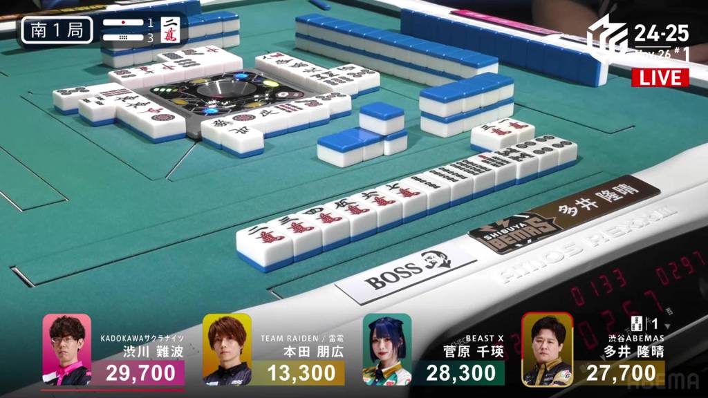 With an uradora hit, Shibukawa wins the hand with Riichi/Pinfu/Tanyao/Sanshoku/Ura 1 for 12,000 plus Matsumoto’s riichi stick. The win pushes Shibukawa into 1st place and Matsumoto into the negatives.