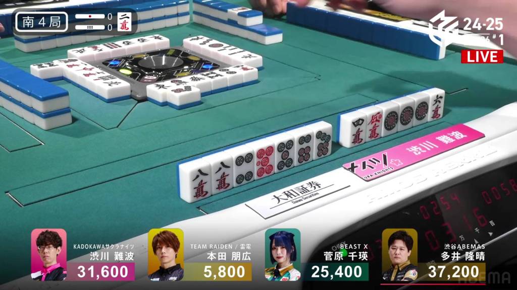 In S4-0, Shibukawa is in 2nd place, 6,200 ahead of 3rd place Sugawara and 5,600 behind 1st place Ooi. For Shibukawa to take 1st place, he needs a 2/50 or 3/25 direct hit, a 3/30 tsumo, or a 3/50 or 4/25 ron.