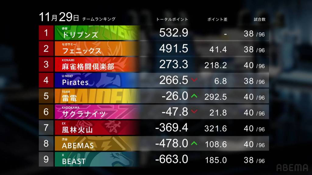 Beast X and Akasaka Drivens both played only two games and dropped this week. On Tuesday, the Beast had back-to-back 3rds to push them deeper into 9th place. For the Akasaka Drivens, a 2nd by Futoshi and a 4th by Taro dropped the team and pushed them closer to the approaching Sega Sammy Phoenix.
