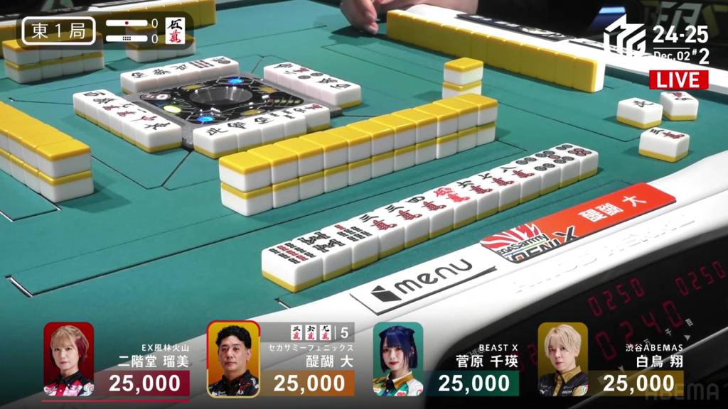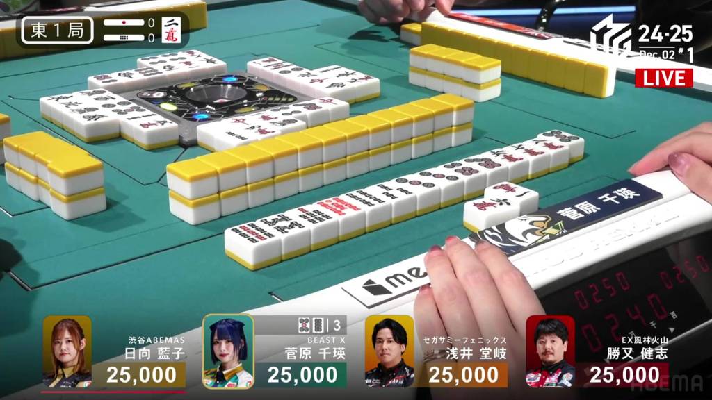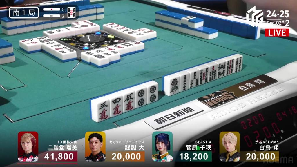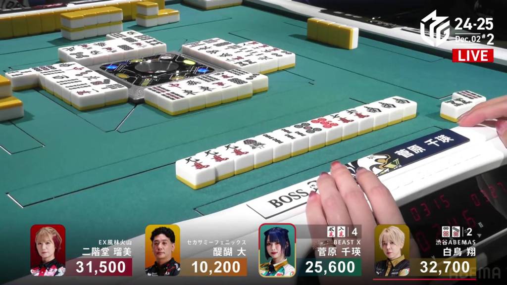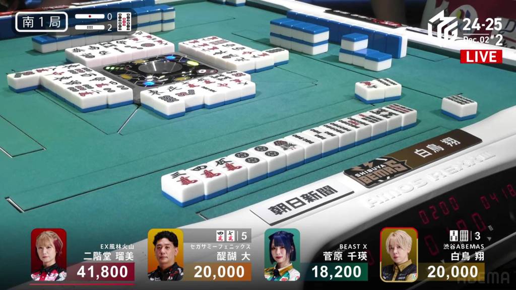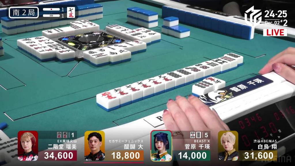 In S2-2, Sugawara is the dealer in 1st place and holding a 10,000 lead over 2nd place Takaki.
