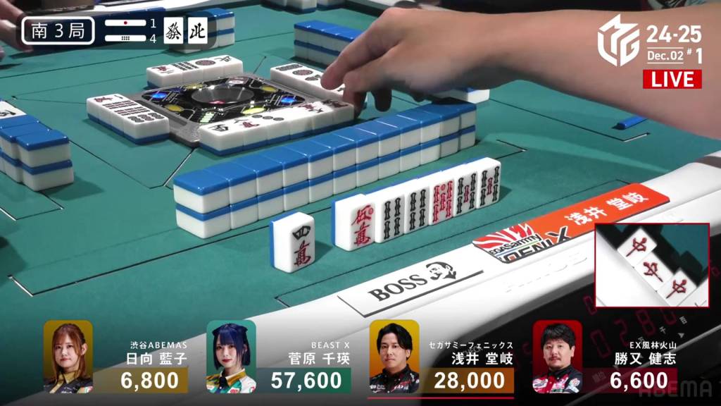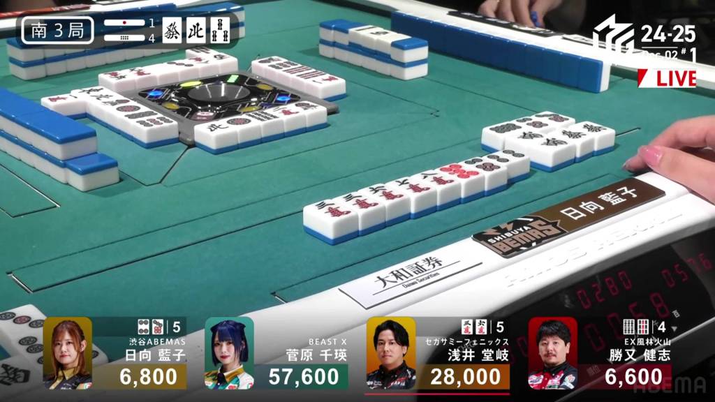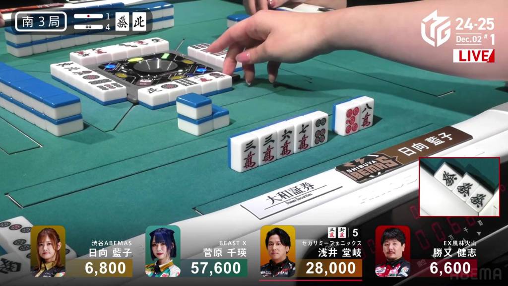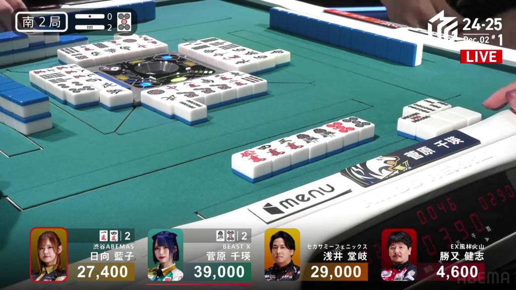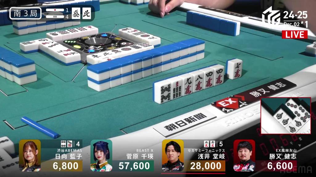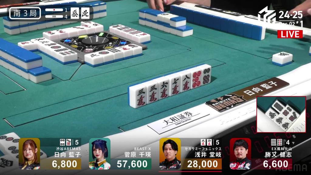 In S3-4, Hinata is in 3rd place and just 200 ahead of 4th place Katsumata. Neither player has a 4th place yet this season. With a riichi stick and four honba on the table, the one who wins here will have a good advantage going into South 4.