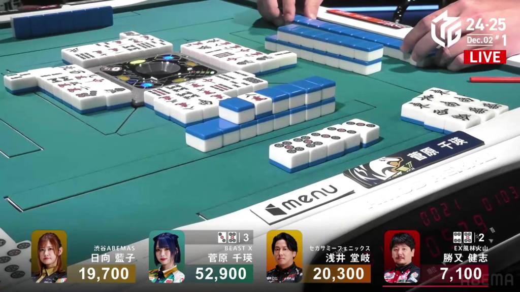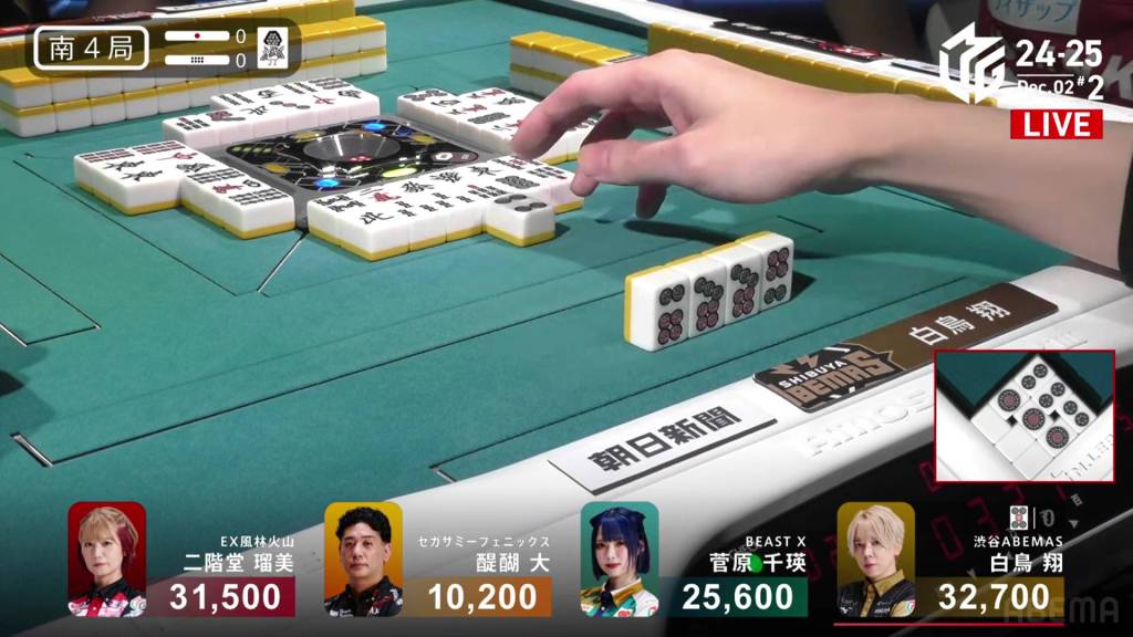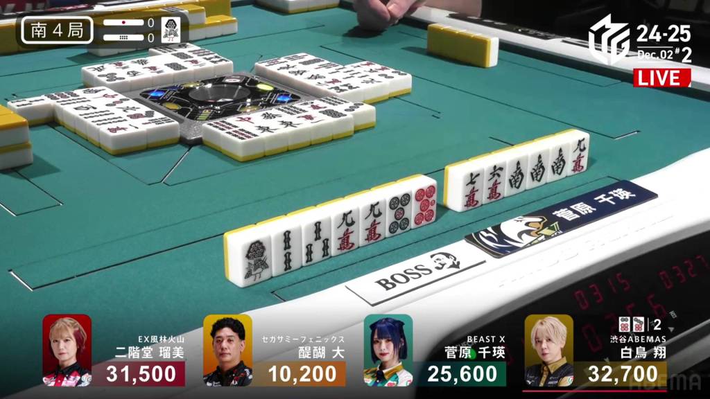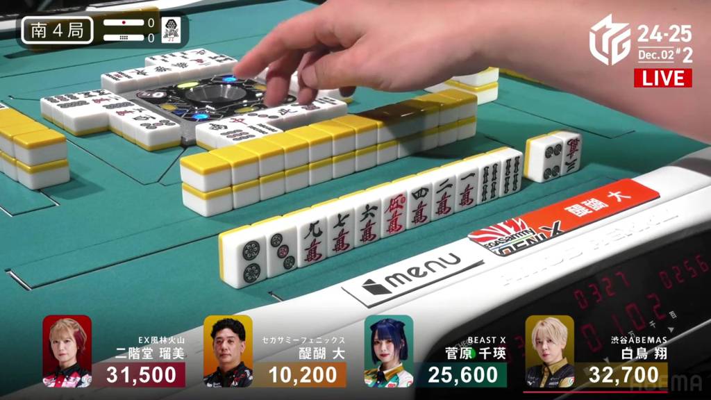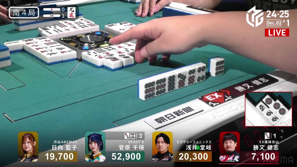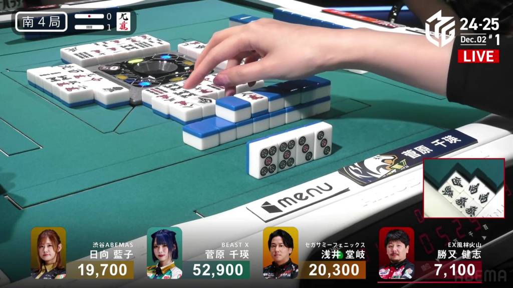 In S3-4, Hinata is in 3rd place and just 200 ahead of 4th place Katsumata. Neither player has a 4th place yet this season. With a riichi stick and four honba on the table, the one who wins here will have a good advantage going into South 4.