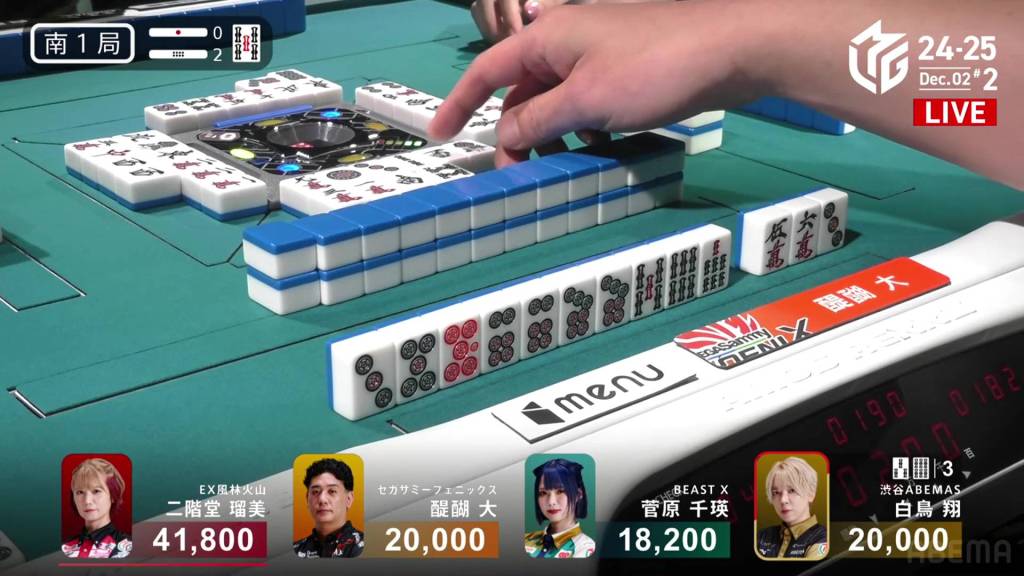 In S1-2, Shiratori is tied in 2nd place, chasing 1st place dealer Rumi who is 21,800 ahead. A win this hand would put him into sole 2nd and move him a bit closer to the top.
