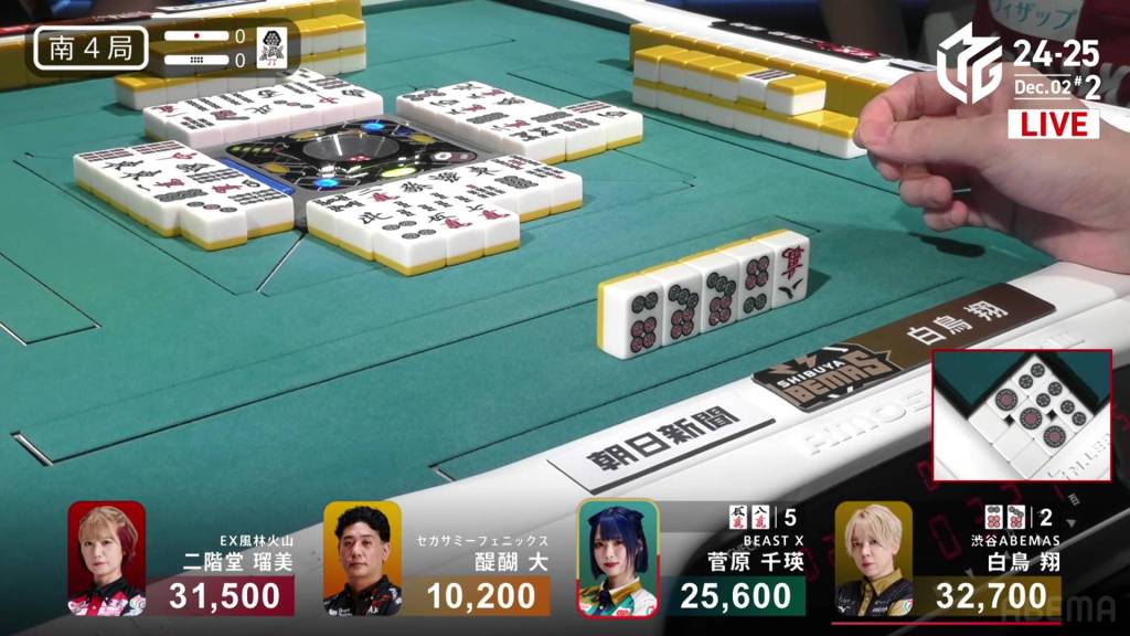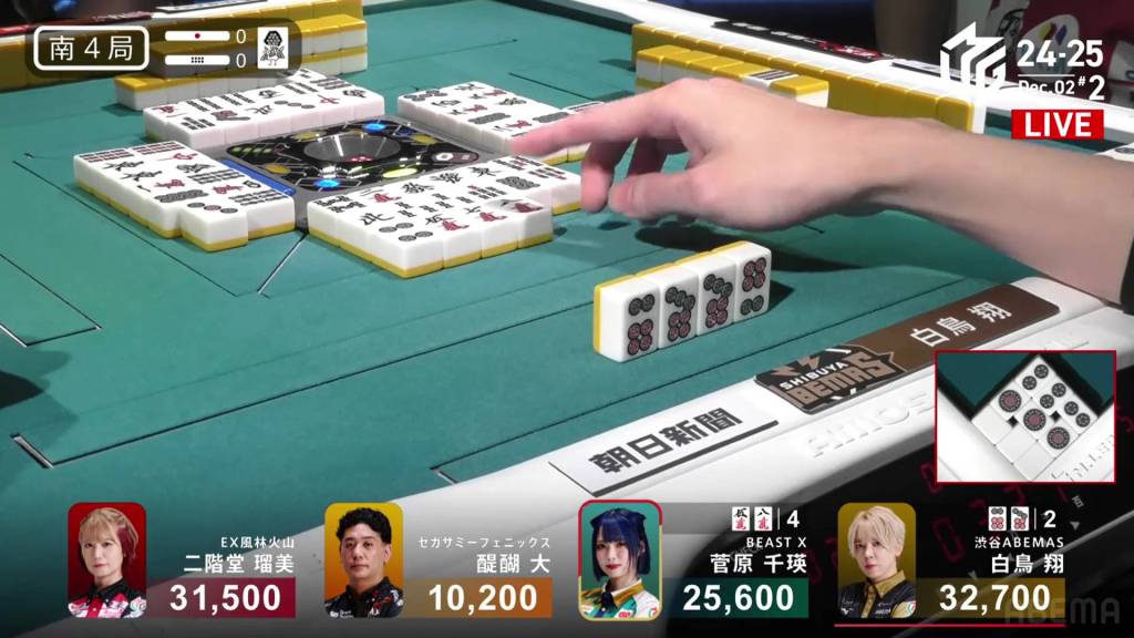 …the 4p and wins the hand! Hinata wins with Rinshan/Green Dragon/Dora 4/Aka 1 for 3,000+400/6,000+400 plus a riichi stick, putting her just 600 behind 2nd place Takaki going into South 4.