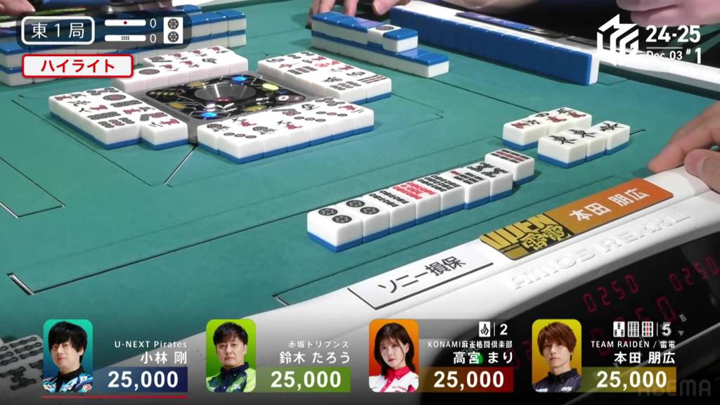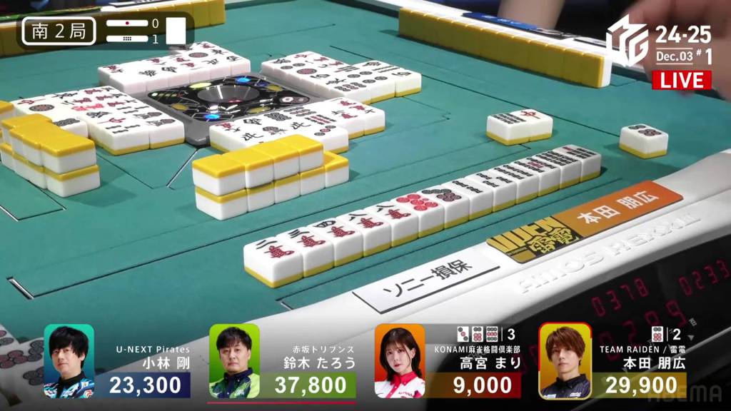 At the start of the third row, Honda draws the 9s and wins the hand. Honda wins with East/Dora 2/Aka 1 for 2,000/4,000.