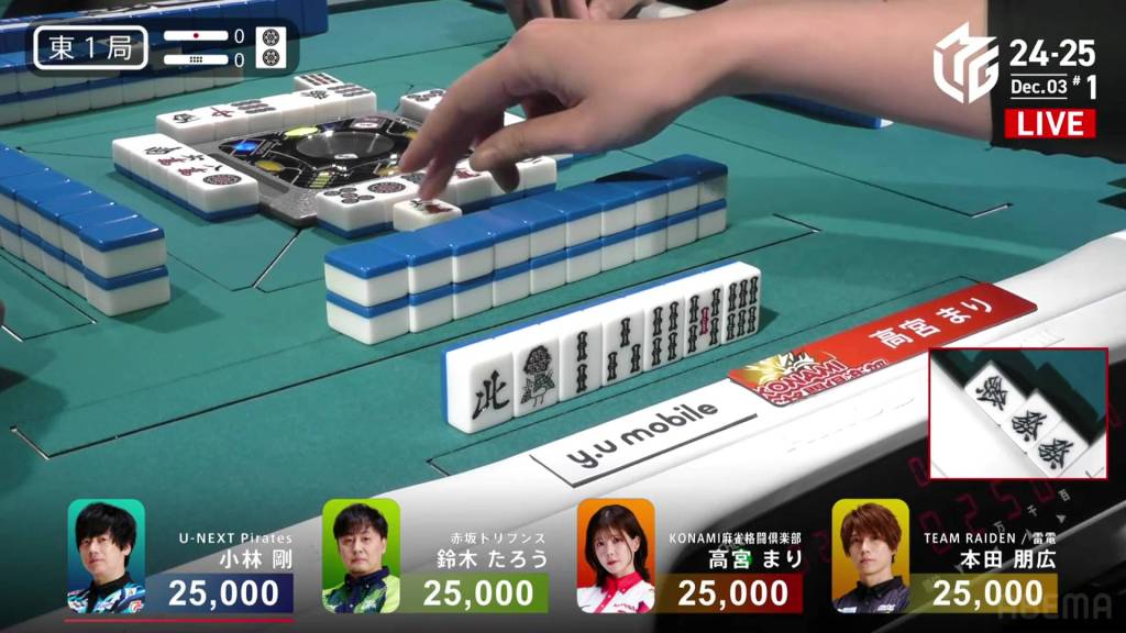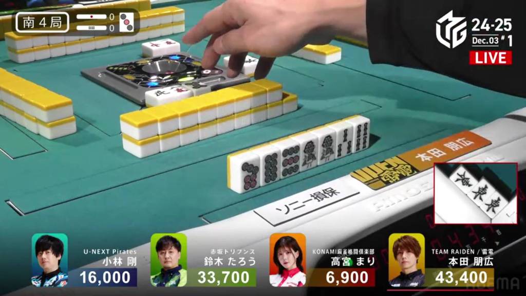 At the start of the second row, Honda breaks his north pair to aim for the extra value. In the middle of the row, he draws a 3p to potentially use with the red 5p and advances to iishanten.