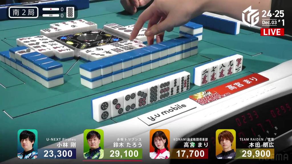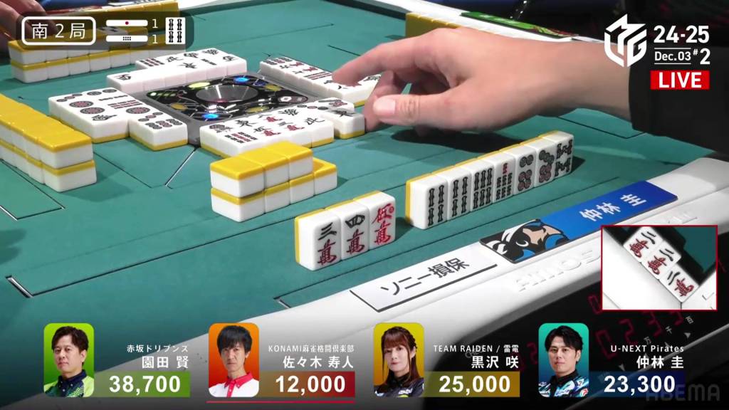 Back to Nakabayashi, he fills in a 3m kanchan at the end of the second row to get to iishanten. A turn later, Nakabayashi gets to tenpai and calls riichi on a 3p kanchan. Two turns later, Sonoda draws and discards the 3p and deals into Sonoda. Getting the uradora, Nakabayashi wins the hand with Riichi/Tanyao/Ura 1 for 7,700 plus Sonoda’s riichi stick, moving Nakabayashi into 3rd place.