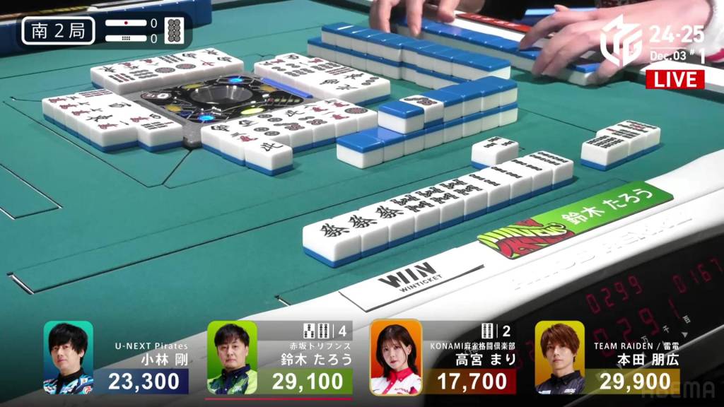 When the 6s comes out from Kobayashi, Taro calls chii and gets to tenpai on a 34s wait. With a 4s win, he would have a mangan.