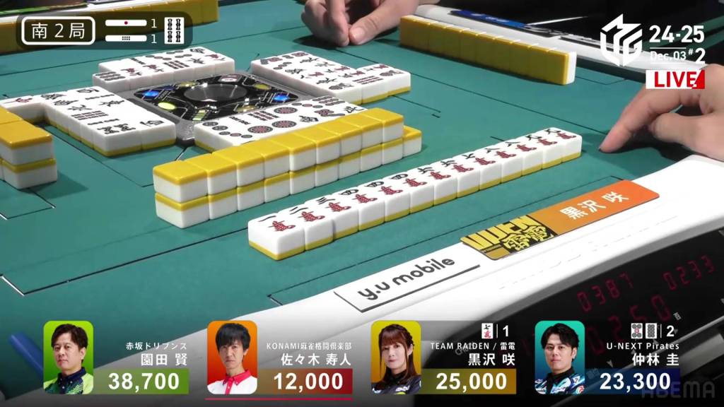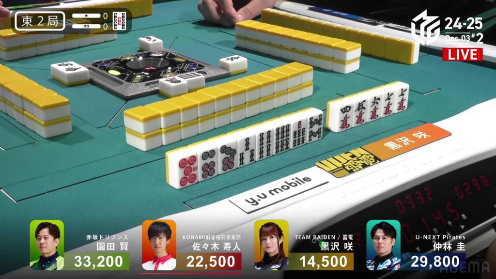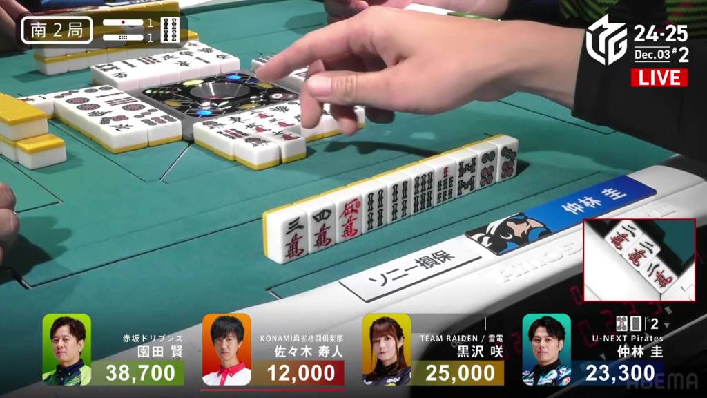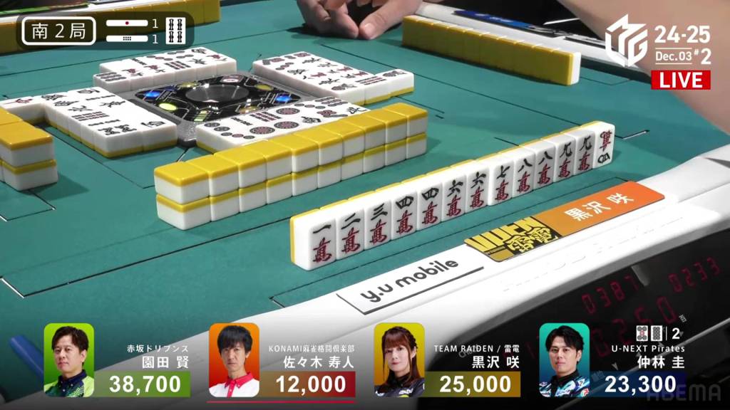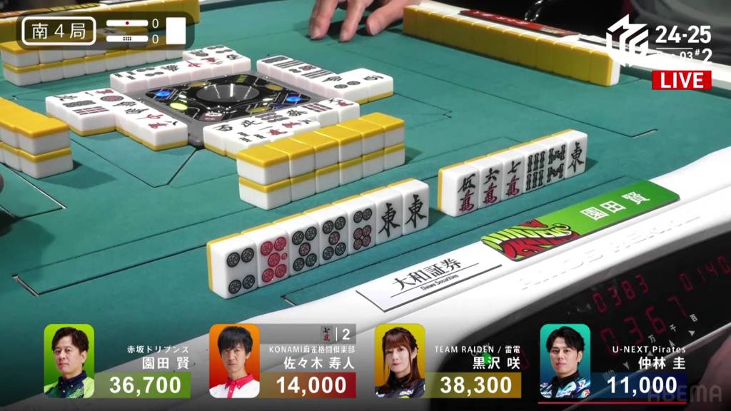 Kurosawa wins the hand with Chinitsu/Iipeikou for 12,000+300 plus a riichi stick, bringing Kurosawa within 400 of 1st place and Nakabayashi down to 4th.