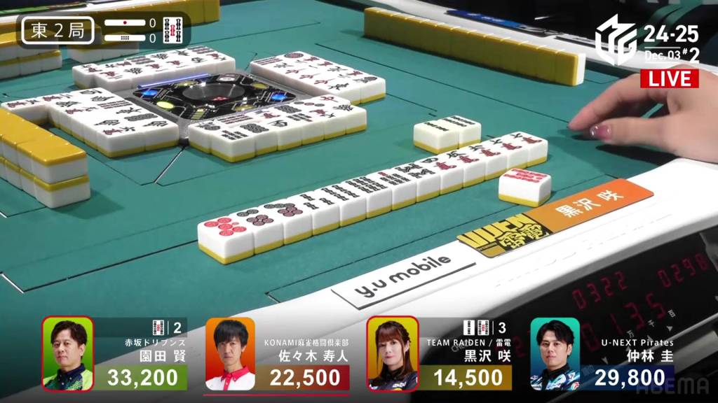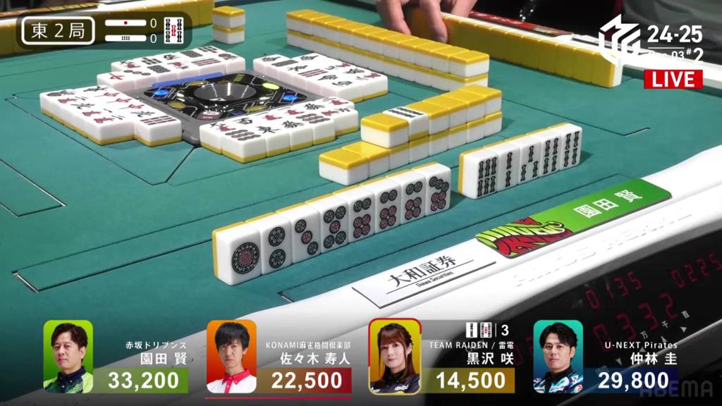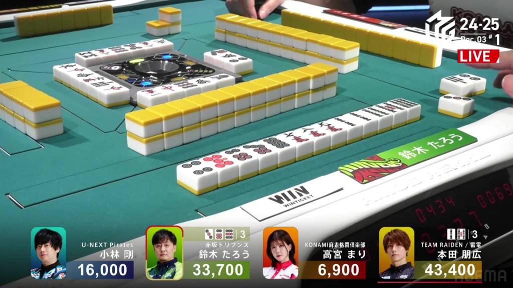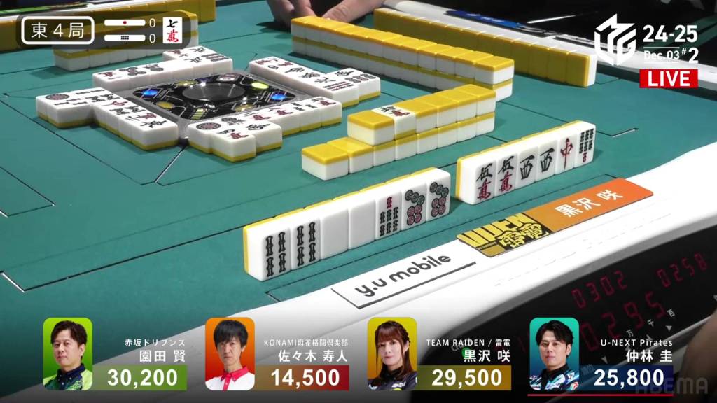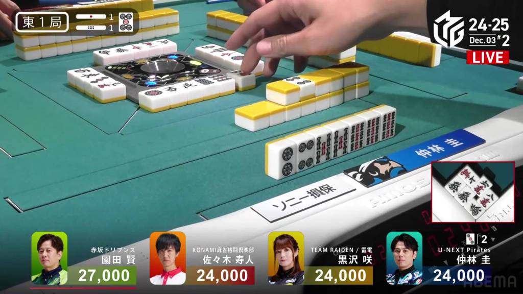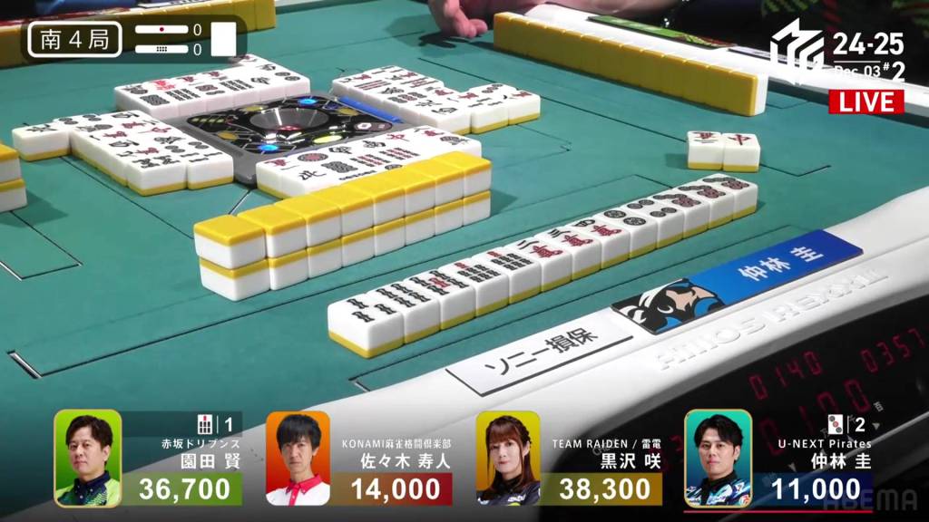 Kurosawa wins the hand with Chinitsu/Iipeikou for 12,000+300 plus a riichi stick, bringing Kurosawa within 400 of 1st place and Nakabayashi down to 4th.