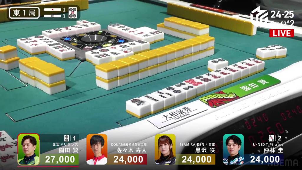 In E1-1, Sonoda remains the dealer after being the only one tenpai in the first hand of the game. A riichi stick and a honba are in the pot.